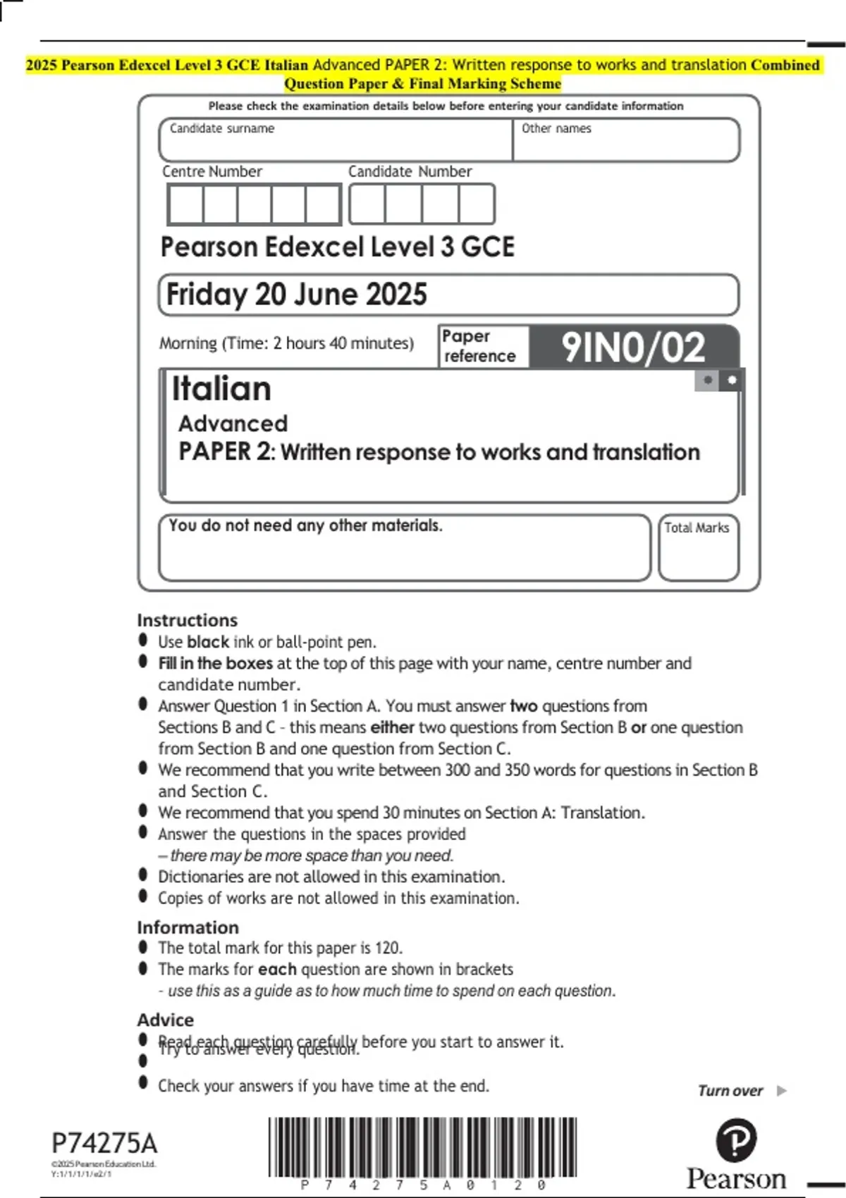 2025 Pearson Edexcel Level 3 GCE Italian Advanced PAPER 2: Written response to works and translation Combined