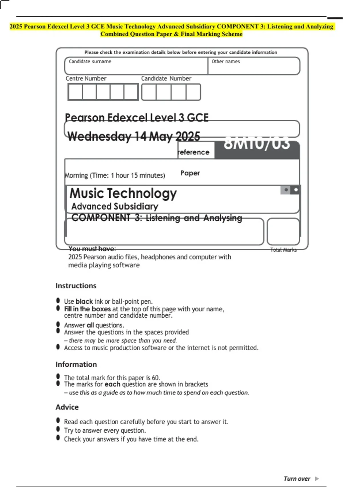 • Access to music production software or the internet is not permitted.