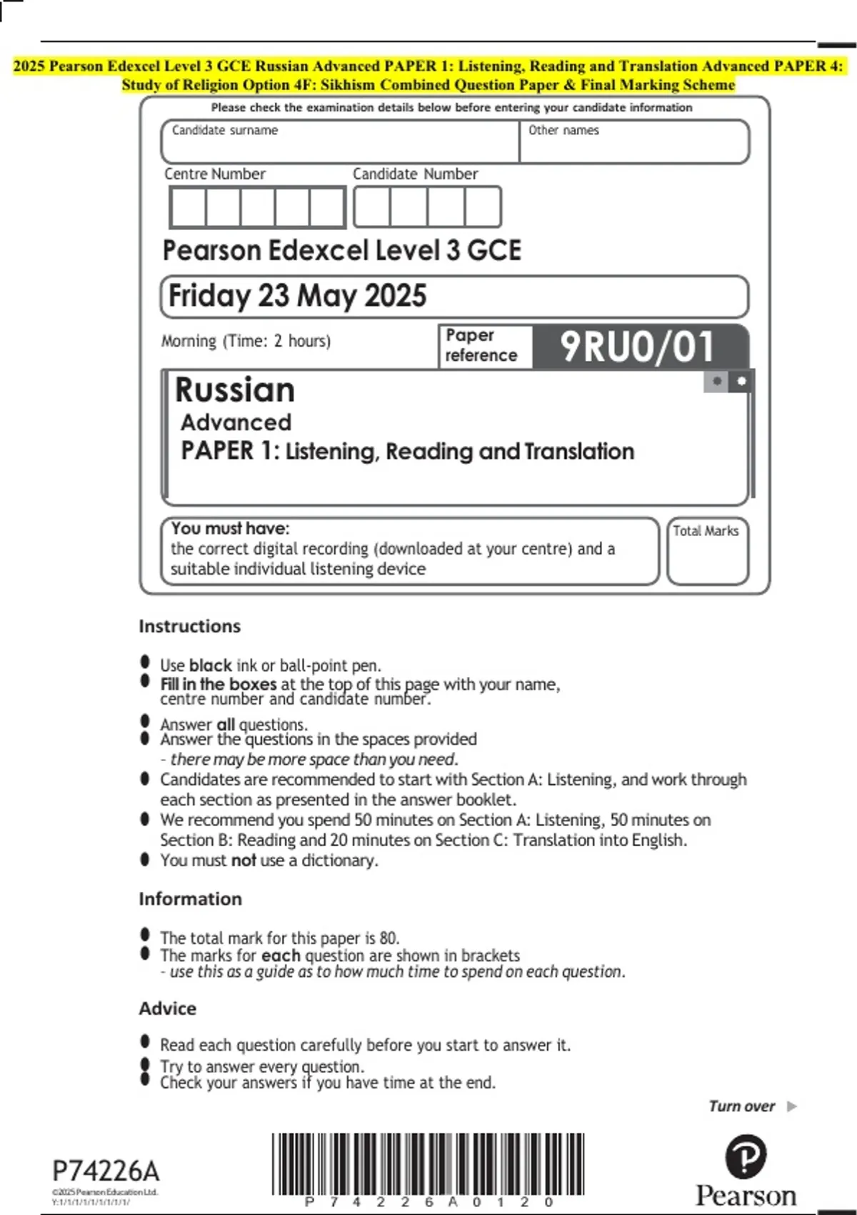 2025 Pearson Edexcel Level 3 GCE Russian Advanced PAPER 1: Listening, Reading and Translation Advanced PAPER 4: Study of Religion Option 4F: Sikhism Combined Question Paper & Final Marking Scheme