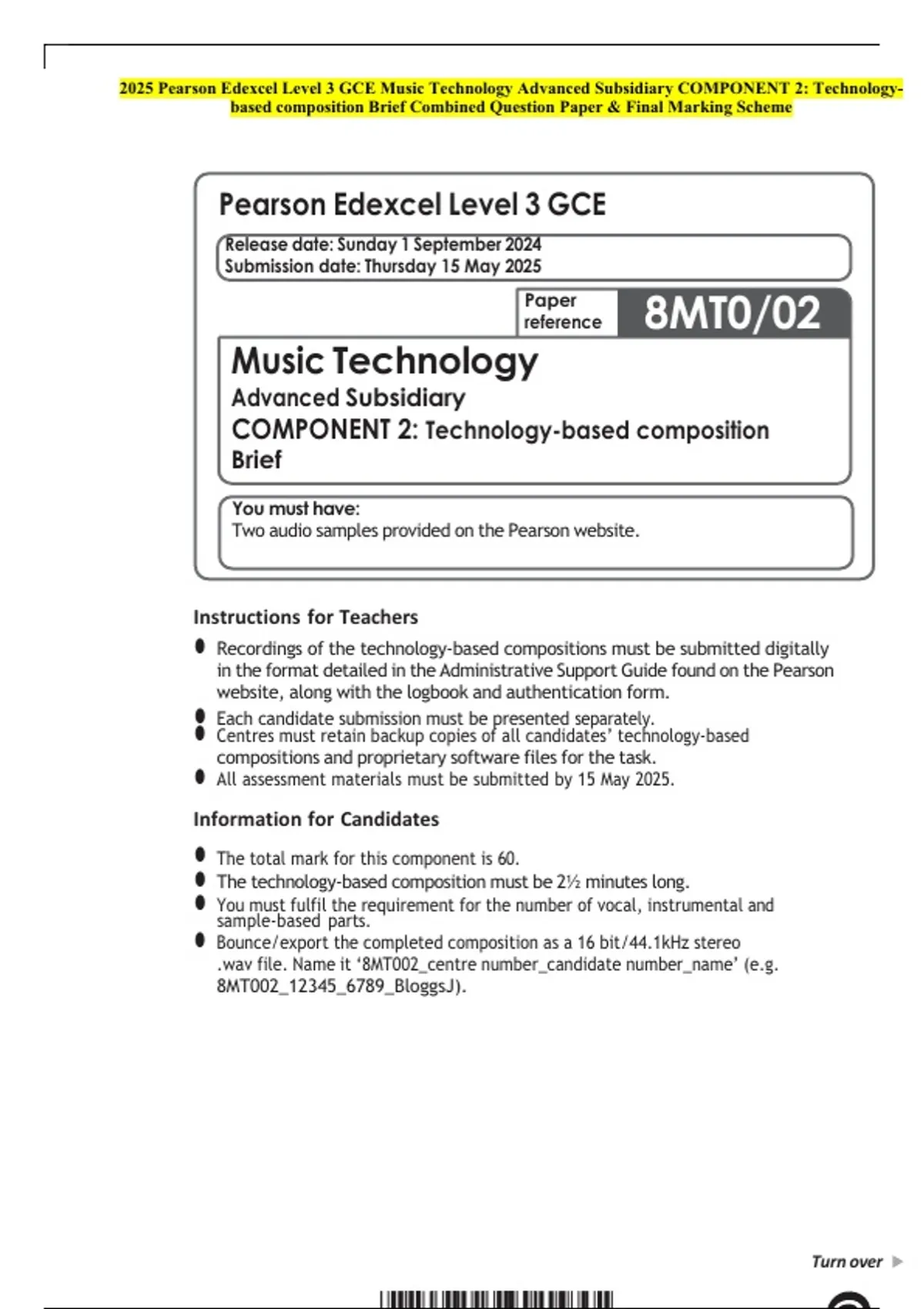 2025 Pearson Edexcel Level 3 GCE Music Technology Advanced Subsidiary COMPONENT 2: Technology based composition Brief Combined Question Paper & Final Marking Scheme