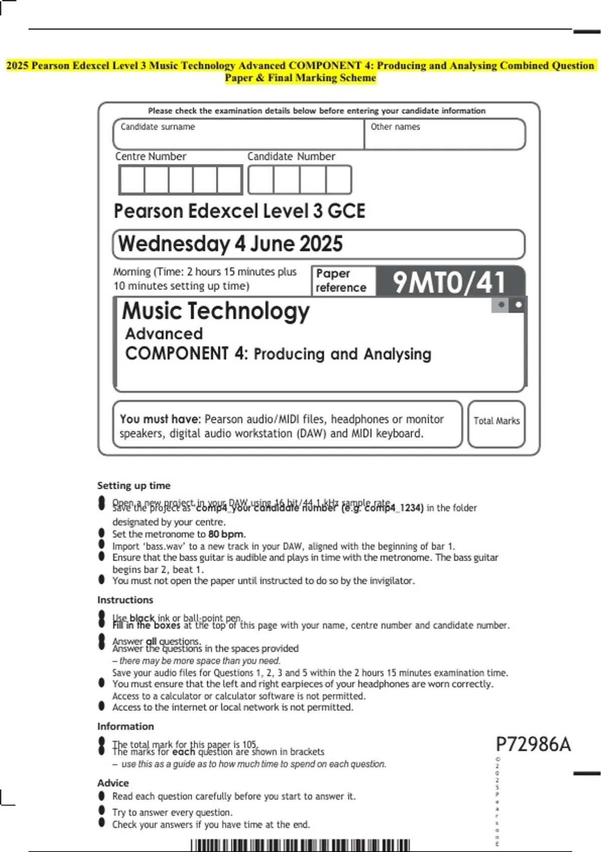 2025 Pearson Edexcel Level 3 Music Technology Advanced COMPONENT 4: Producing and Analysing Combined Question Paper & Final Marking Scheme