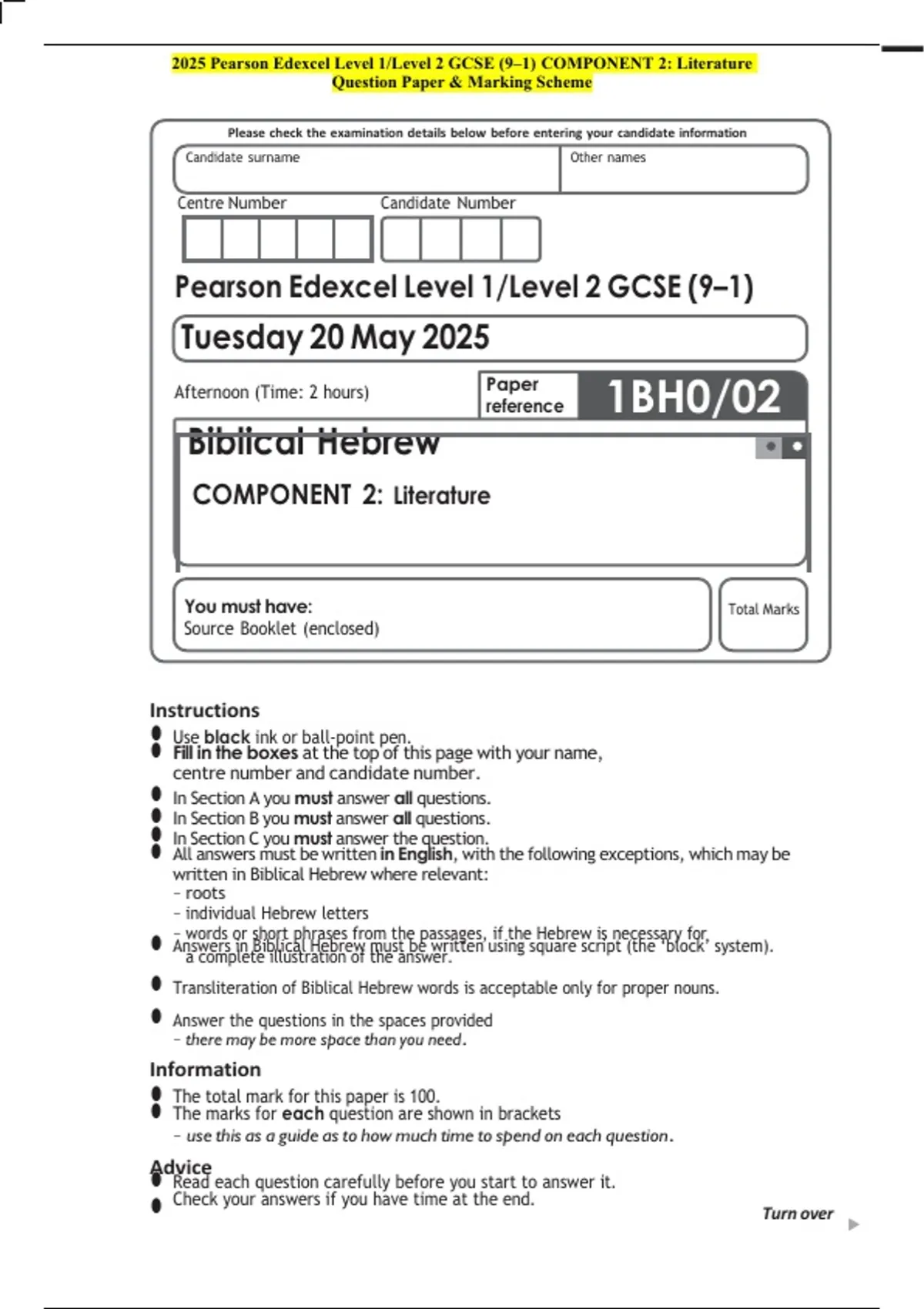 • Answers in Biblical Hebrew must be written using square script (the ‘block’ system).