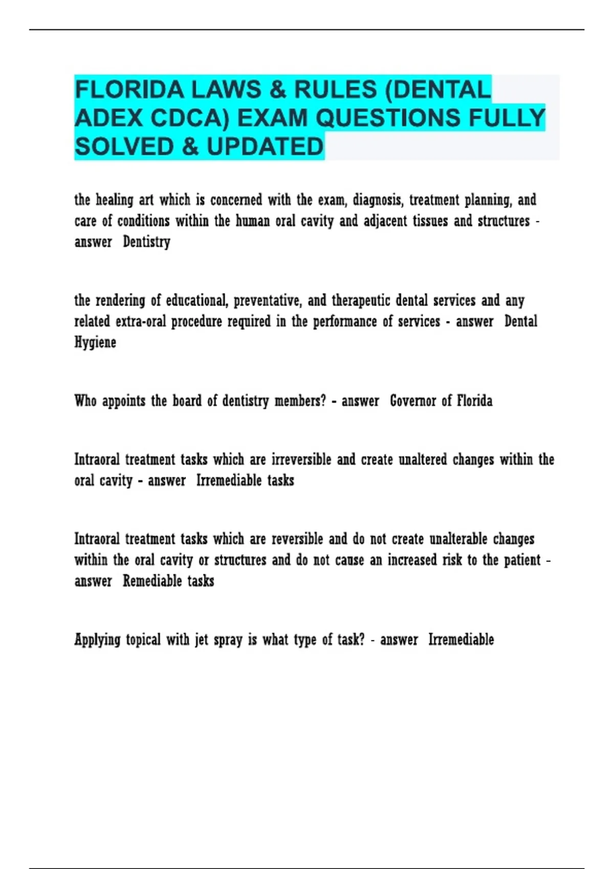 Prepare for the Florida Dental ADEX CDCA Exam with this 2025/2026 updated guide! Includes fully solved questions and answers covering Florida laws and rules for complete exam readiness.
