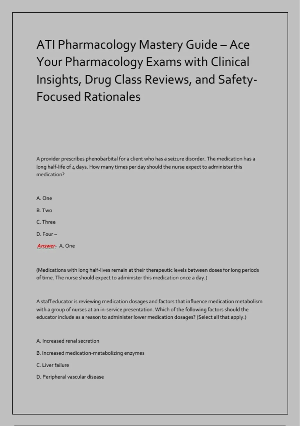 This ATI Pharmacology Mastery Guide is a high-yield, clinically grounded resource designed to help nursing students excel in ATI pharmacology assessments and build a strong foundation for safe medication administration. It covers essential drug classifications, mechanisms of action, therapeutic uses, side effects, contraindications, and nursing considerations. Organized by system and drug class, the guide includes focused reviews on cardiovascular agents, antibiotics, CNS medications, endocrine therapies, respiratory drugs, and more. It emphasizes priority nursing actions, patient education, and adverse effect recognition—key components of ATI and NCLEX-style testing. Learners will also explore high-alert medications, black box warnings, and strategies for minimizing medication errors.