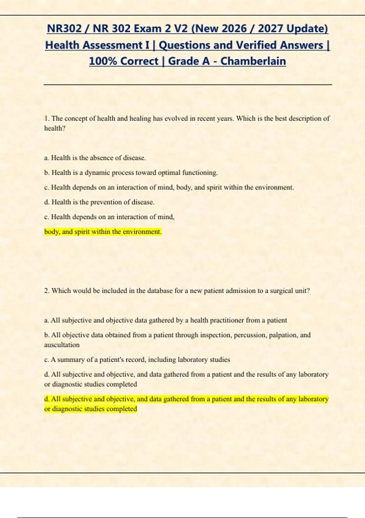 Prepare for NR 302 Exam 2 with this updated 2026–2027 Health Assessment study guide. Includes assessment techniques, head-to-toe exam review, clinical reasoning concepts, and practice questions to help improve test performance.