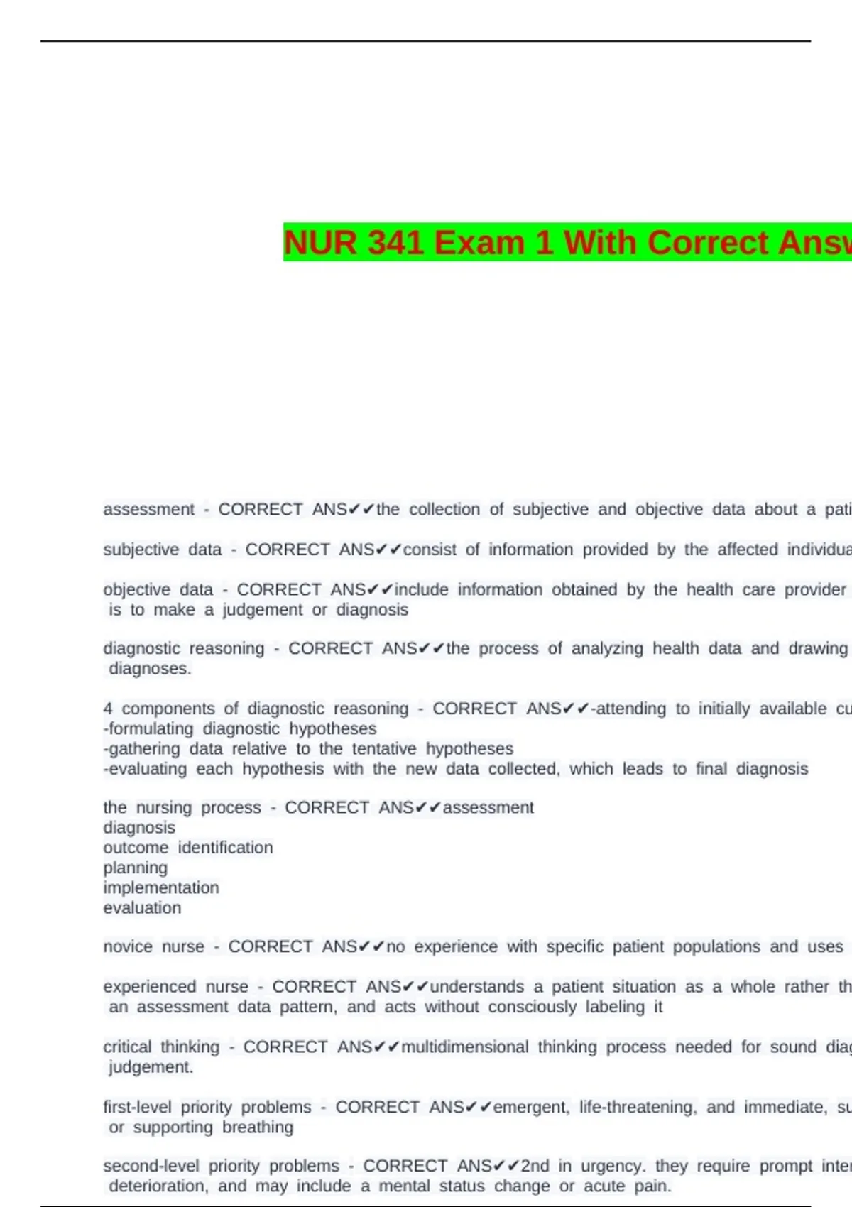 NUR 341 Exam 1 With Correct Answers