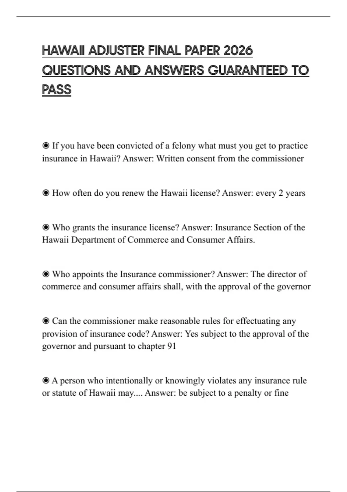HAWAII ADJUSTER FINAL PAPER 2026 QUESTIONS AND ANSWERS GUARANTEED TO PASS
