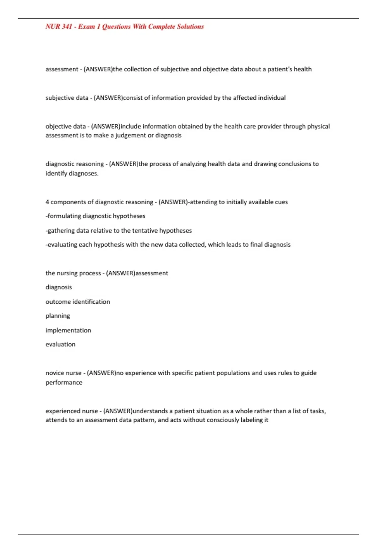 NUR 341 - Exam 1 Questions With Complete Solutions