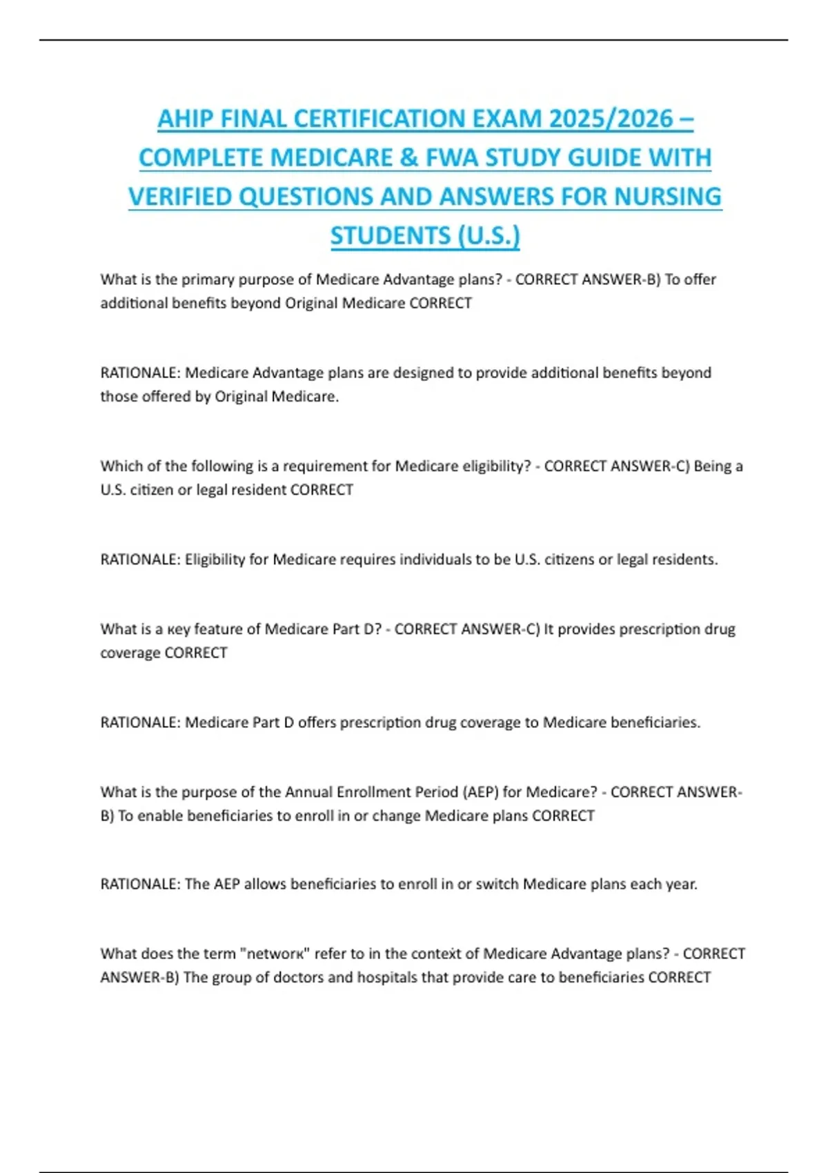 VERIFIED QUESTIONS AND ANSWERS FOR NURSING