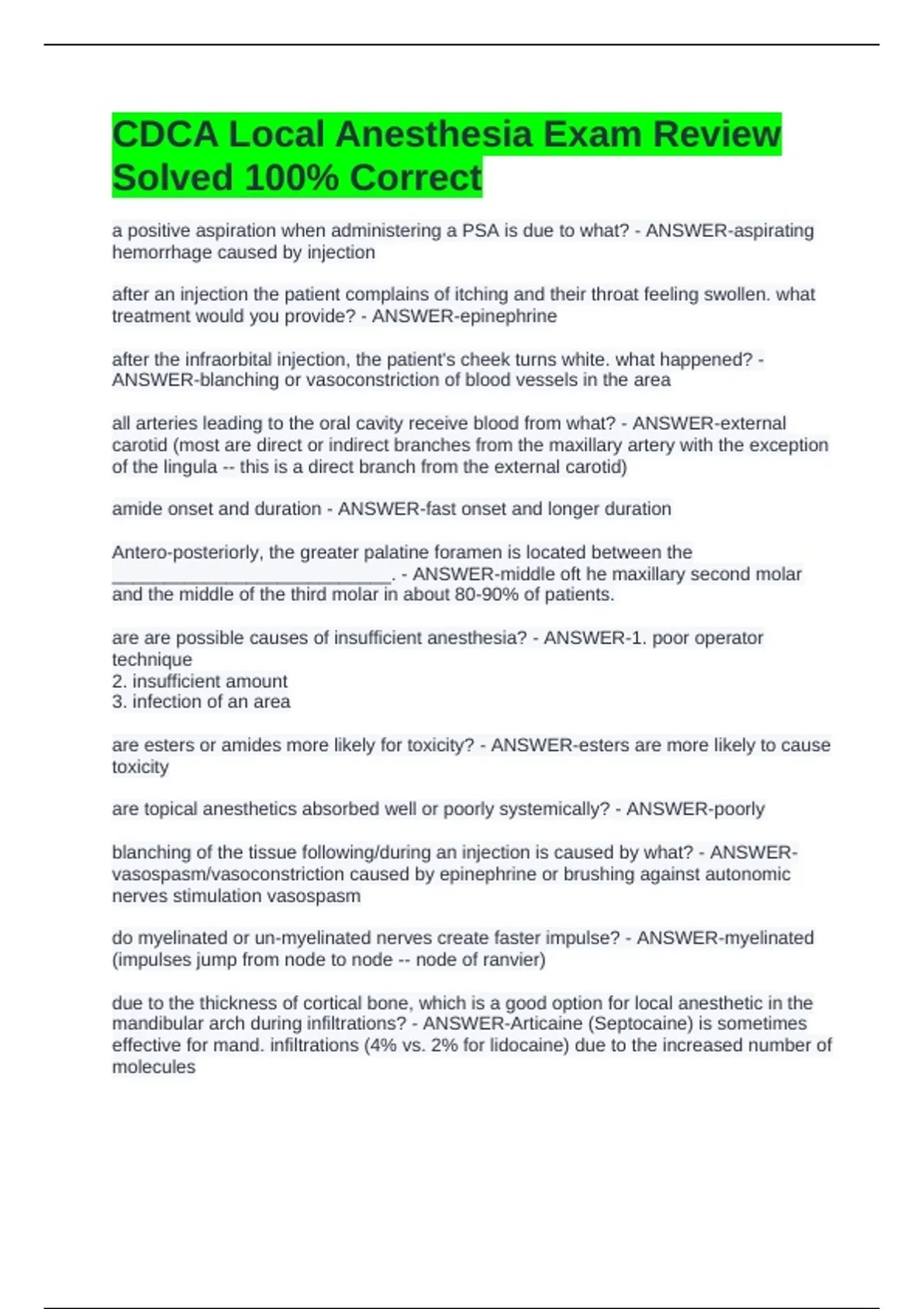 CDCA Local Anesthesia Exam Review Solved 100% Correct