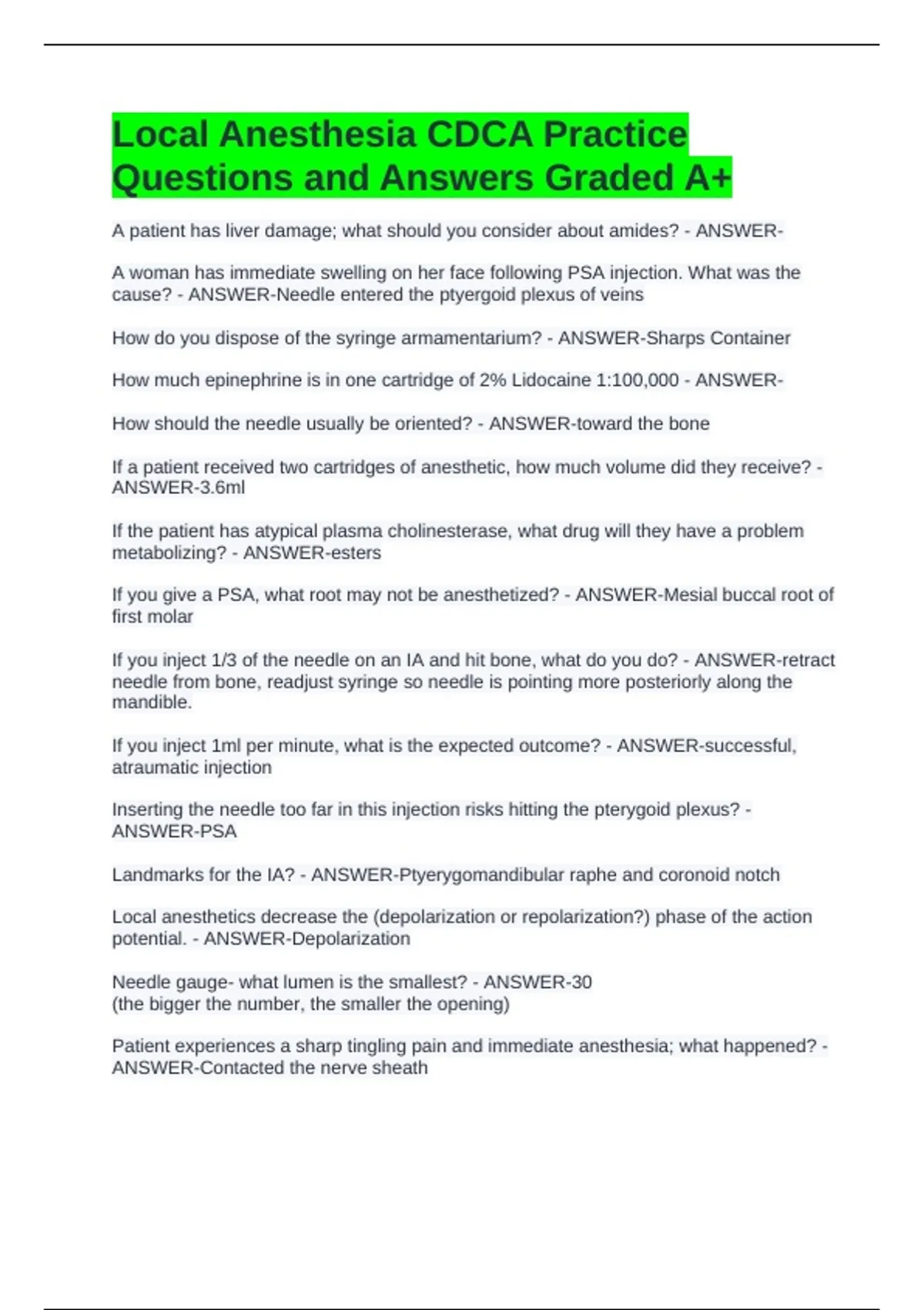 Local Anesthesia CDCA Practice Questions and Answers Graded A+