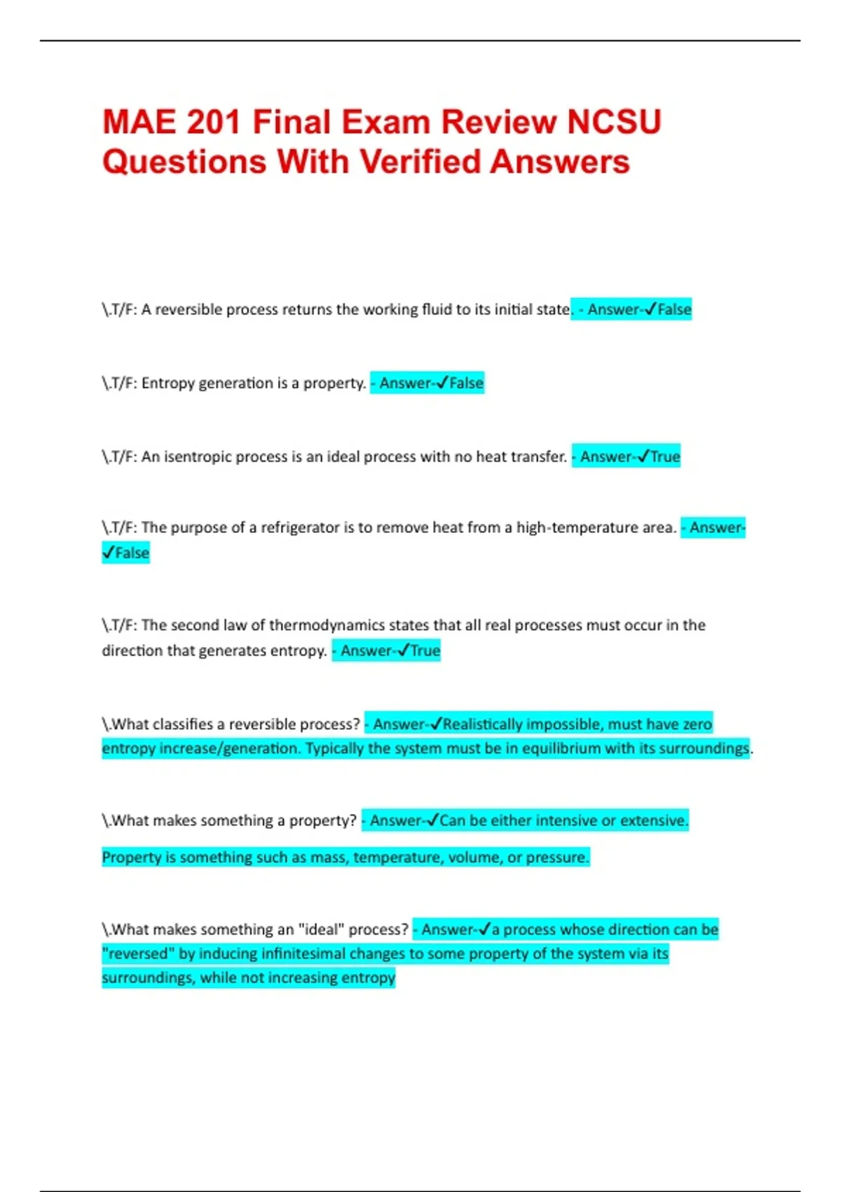 MAE 201 Final Exam Review NCSU Questions With Verified Answers || 100% pass .T/F: A reversible process returns the working fluid to its initial state. - Answer-False .T/F: Entropy generation is a property. - Answer-False .T/F: An isentropic process is an ideal process with no heat transfer. - Answer-True .T/F: The purpose of a refrigerator is to remove heat from a high-temperature area. - Answer-False .T/F: The second law of thermodynamics states that all real processes must occur in the direction that generates entropy. - Answer-True .What classifies a reversible process? - Answer-Realistically impossible, must have zero entropy increase/generation. Typically the system must be in equilibrium with its surroundings. .What makes something a property? - Answer-Can be either intensive or extensive. Property is something such as mass, temperature, volume, or pressure. .What makes something an "ideal" process? - Answer-a process whose direction can be "reversed" by inducing infinitesimal changes to some property of the system via its surroundings, while not increasing entropy .What is the second law of thermodynamics? - Answer-the total entropy of an isolated system can only increase over time. It can remain constant in ideal cases where the system is in a steady state (equilibrium) or undergoing a reversible process. The increase in entropy accounts for the irreversibility of natural processes, and the asymmetry between future and past. .What happens when air is throttled? (choose all that apply) a) Temp held constant b) Pressure constant c) Enthalphy constant d) Mass constant - Answer-Answers include: c) enthalphy remains constant also work done is 0 a) temperature held constant