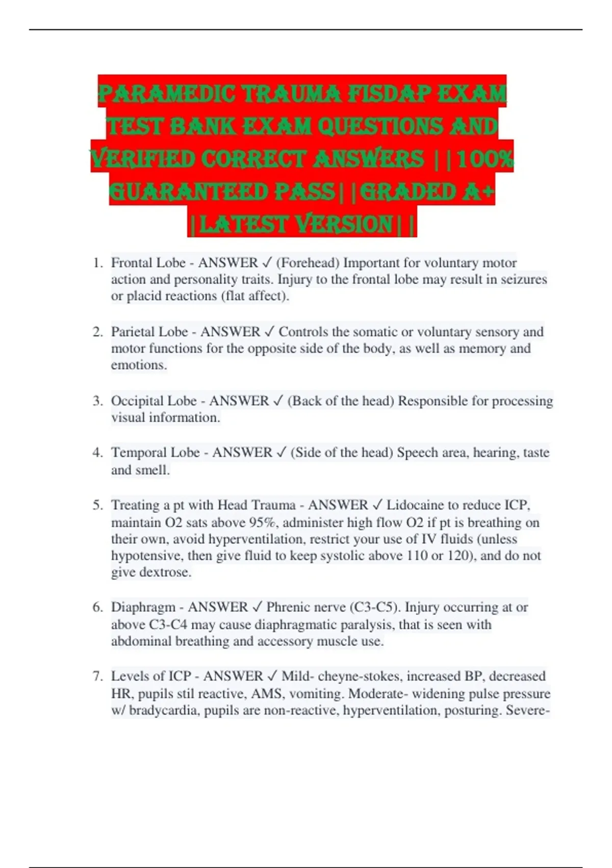 Paramedic Trauma FISDAP EXAM TEST BANK EXAM QUESTIONS AND VERIFIED CORRECT ANSWERS ||100% GUARANTEED PASS||GRADED A+ |LATEST VERSION|| 1. Frontal Lobe - ANSWER (Forehead) Important for voluntary motor action and personality traits. Injury to the frontal lobe may result in seizures or placid reactions (flat affect). 2. Parietal Lobe - ANSWER Controls the somatic or voluntary sensory and motor functions for the opposite side of the body, as well as memory and emotions. 3. Occipital Lobe - ANSWER (Back of the head) Responsible for processing visual information. 4. Temporal Lobe - ANSWER (Side of the head) Speech area, hearing, taste and smell. 5. Treating a pt with Head Trauma - ANSWER Lidocaine to reduce ICP, maintain O2 sats above 95%, administer high flow O2 if pt is breathing on their own, avoid hyperventilation, restrict your use of IV fluids (unless hypotensive, then give fluid to keep systolic above 110 or 120), and do not give dextrose. 6. Diaphragm - ANSWER Phrenic nerve (C3-C5). Injury occurring at or above C3-C4 may cause diaphragmatic paralysis, that is seen with abdominal breathing and accessory muscle use. 7. Levels of ICP - ANSWER Mild- cheyne-stokes, increased BP, decreased HR, pupils stil reactive, AMS, vomiting. Moderate- widening pulse pressure w/ bradycardia, pupils are non-reactive, hyperventilation, posturing. Severe- blown pupil, biot's respirations, flaccid paralysis, irregular pulse rate, fluctuating BP (usually hypotension). 8. Cheyne- Stokes Respirations - ANSWER Respirations that are fast and then become slow, with intervening periods of apnea. Common in people with head injuries/ICP. 9. Biots Respirations - ANSWER Characterized by irregular rate, pattern, and volume of breathing with intermittent periods of apnea. 10.Babinkski Reflex - ANSWER Occurs when the toes move upward in response to stimulation of the sole of the foot. Under normal circumstances, the toes move downward. 11.Coup Contrecoup - ANSWER Front and rear injury. Brain slams into the front of the skull, and then slams into the back end of the skull. 12.Autoregulation - ANSWER The body responds to a decrease in CPP by increasing the MAP. Resulting in cerebral vasodilation and increased cerebral blood flow. However, this is a vicious cycle cause it actually increases ICP. 13.Decorticate - ANSWER Flexor posturing. Pt's limbs will be facing toward their core, involving flexion of the arms and legs.
