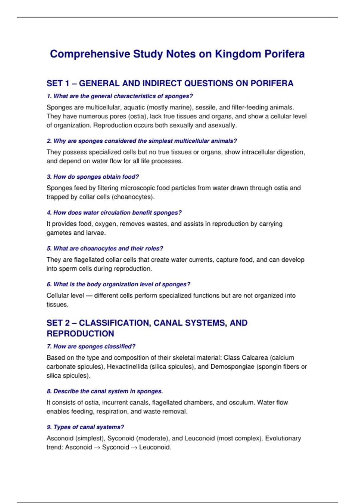 SET 1 – GENERAL AND INDIRECT QUESTIONS ON PORIFERA
