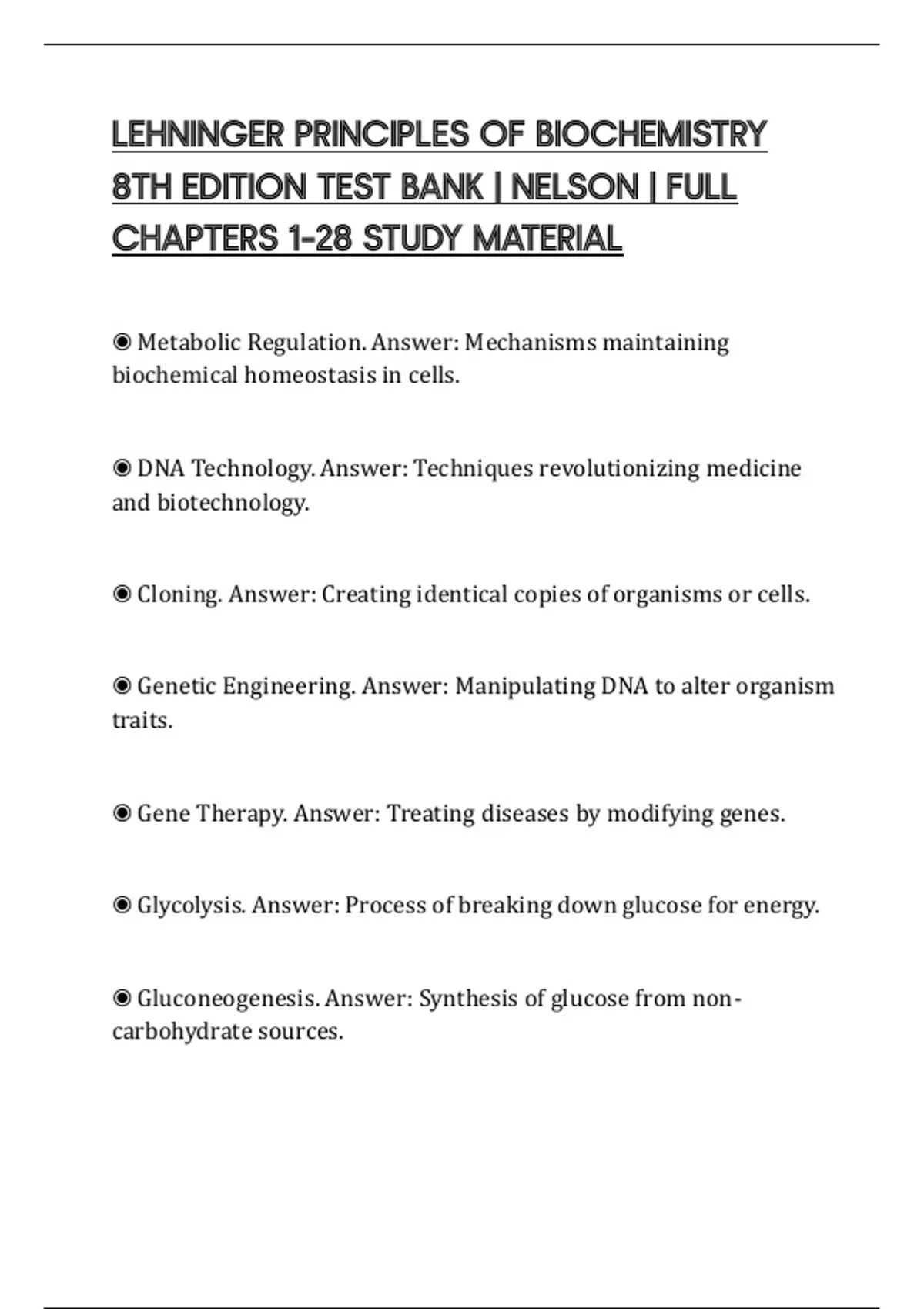 LEHNINGER PRINCIPLES OF BIOCHEMISTRY 8TH EDITION TEST BANK | NELSON | FULL CHAPTERS 1–28 STUDY MATERIAL