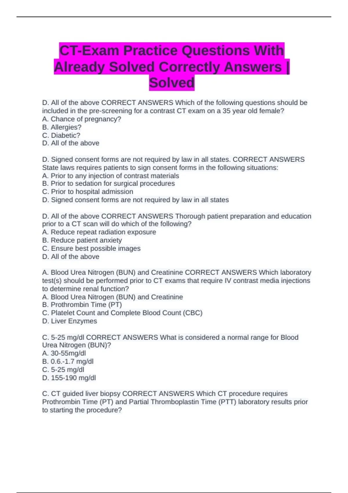 CT-Exam Practice Questions With Already Solved Correctly Answers | Solved