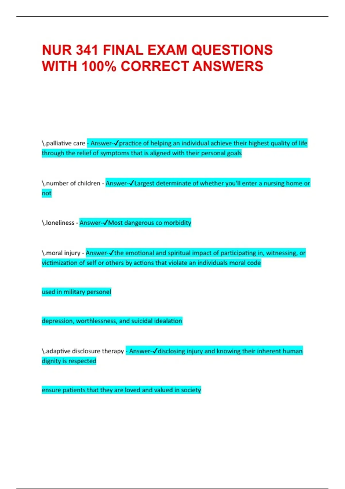 NUR 341 FINAL EXAM QUESTIONS WITH 100% CORRECT ANSWERS .palliative care - Answer-practice of helping an individual achieve their highest quality of life through the relief of symptoms that is aligned with their personal goals .number of children - Answer-Largest determinate of whether you'll enter a nursing home or not .loneliness - Answer-Most dangerous co morbidity .moral injury - Answer-the emotional and spiritual impact of participating in, witnessing, or victimization of self or others by actions that violate an individuals moral code used in military personel depression, worthlessness, and suicidal idealation .adaptive disclosure therapy - Answer-disclosing injury and knowing their inherent human dignity is respected ensure patients that they are loved and valued in society Most effective treatment for moral injury .pain, nausea, sob, anxiety, fluid overload - Answer-Common symptoms in the end of life patient .guppy breathing - Answer-small non perfusing breaths .mottling - Answer-cold bruising from capillary stasis .false - Answer-Vital signs are often a great indicator of impending death .initiation - Answer-development of cancer that is the mutation of cell's genetic structure caused by carcinogens .chemical, radiation, viral - Answer-Types of carcinogens .promotion - Answer-development of cancer that is the reversible proliferation of the altered cell factors include dietary fat, obesity, cigarettes and alcohol .progression - Answer-final stage in the development of cancer increased growth rate and invasiveness resulting in metastasis .cytotoxic T cells - Answer-Immunologic surveillance that resists tumor growth and kill tumor cells by sending out signals .natural killer cells - Answer-Immunologic surveillance that causes cells to lyse tumor cells spontaneously .macrophages - Answer-immunologic surveillance that secrete a tumor lytic enzymes .B cells - Answer-immunologic surveillance that produces antibodies in response to tumor antigens .oncofetal antigens - Answer-tumor markers that cause a protein shift on the surface of the cell .benign - Answer-tumor classification grows slow, localized, encapsulated, well-differentiated, no reoccurrence, not harmful .malignant - Answer-tumor classification rapid growth, metastases, not encapsulated, poorly differentiated (anaplasia), reoccurrence, harmful .anaplasia - Answer-lack of differentiation and pattern with mitosis .carcinoma - Answer-suffix indicating cancer of the epithelial tissue (skin, intestines, breast)
