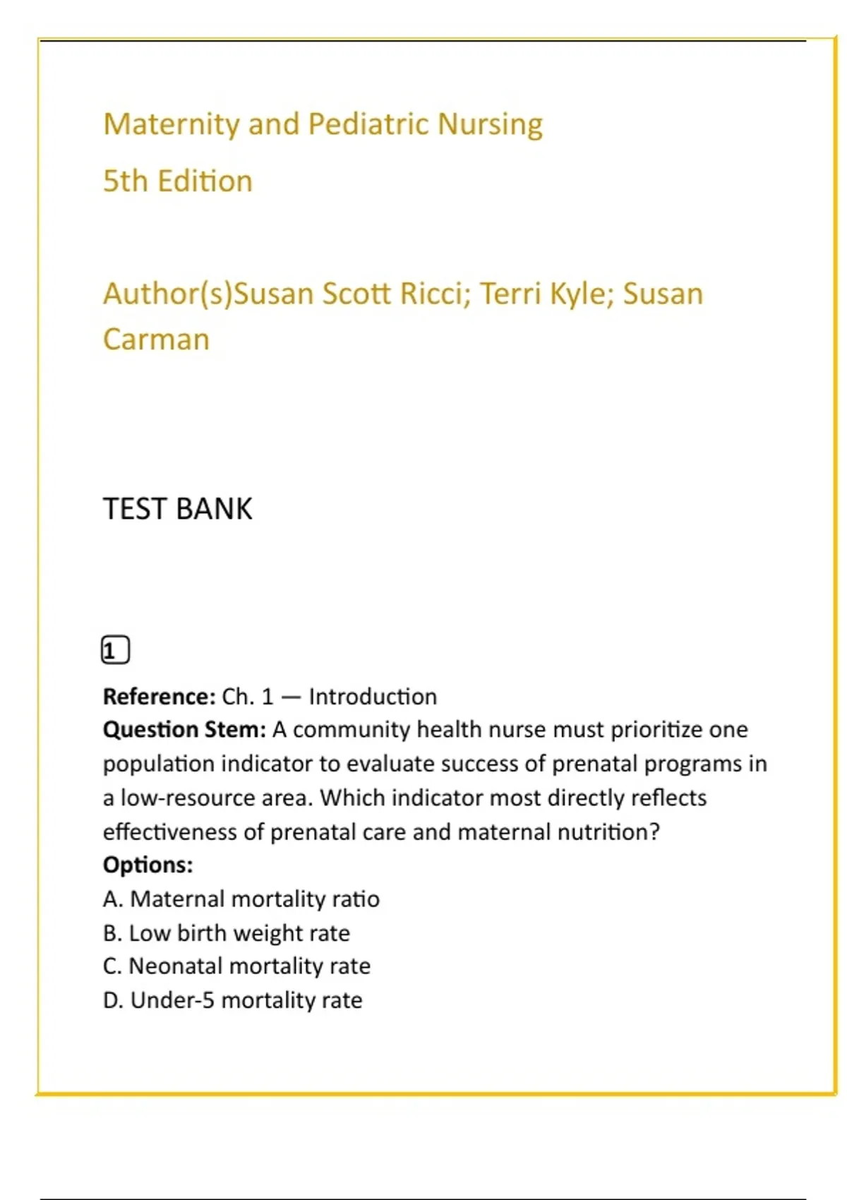 Maternity and Pediatric Nursing Test Bank — Ricci 5th Edition | 20 NCLEX/HESI Qs Per Chapter, 2025 NCLEX Prep Description: Master maternal–child nursing with the most comprehensive digital test bank designed for students and educators using Maternity and Pediatric Nursing (Ricci, Kyle & Carman, 5th Ed.). This complete exam prep package covers ALL chapters and delivers 20 NCLEX/HESI-style questions per chapter, each with correct answers and evidence-based rationales to build clinical reasoning, prioritization, and family-centered care skills. Aligned to the 2025 NCLEX-RN Test Plan, this resource is ideal for NCLEX-RN, HESI, ATI, and classroom assessment. Save study time and boost scores with targeted practice that mirrors exam rigour and focuses on maternal–newborn, newborn stabilization, pediatric growth and development, safety, and health promotion. Questions emphasize application, analysis, and evaluation to strengthen decision-making under test conditions. Features: • Full textbook coverage — ALL chapters included • 20 NCLEX/HESI-style questions per chapter with answers + evidence-based rationales • Aligned to the 2025 NCLEX-RN Test Plan and current clinical standards • Emphasizes clinical reasoning, family-centered care, and patient safety • Ready for NCLEX, HESI, ATI, class quizzes, and remediation • Instant digital download for study on-the-go Prepare smarter: increase confidence, improve critical thinking, and close content gaps with a Ricci-aligned test bank that transforms textbook learning into exam-ready mastery. Keywords: maternity and pediatric nursing test bank Ricci NCLEX questions NCLEX 2025 maternity prep HESI maternity practice questions 20 questions per chapter Ricci pediatric nursing test bank Ricci ATI maternity pediatric practice evidence-based nursing test bank Hashtags: #MaternityNursing #PediatricNursing #NCLEXPrep #RicciTestBank #HESIStudy #2025NCLEX #NursingExamPrep #FamilyCenteredCare #NewbornNursing #ClinicalReasoning