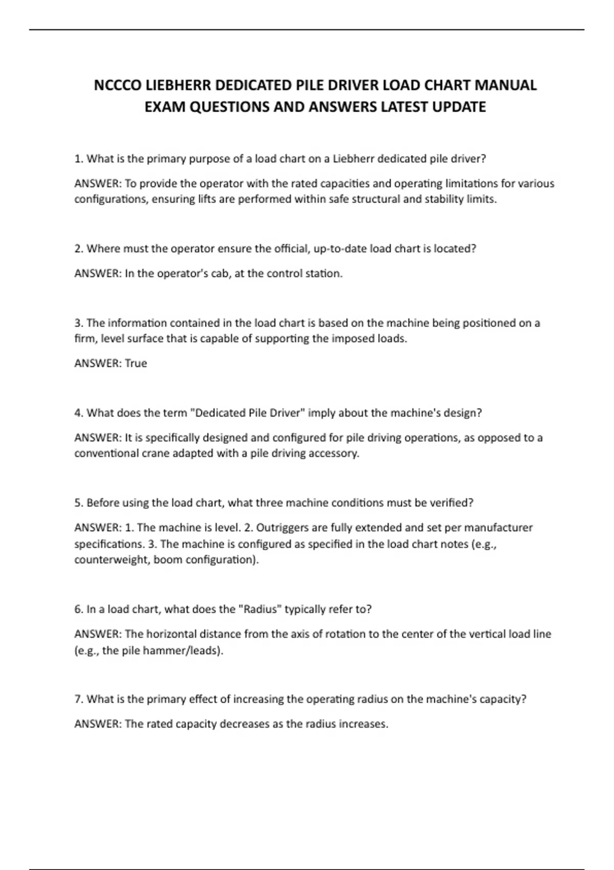 1. What is the primary purpose of a load chart on a Liebherr dedicated pile driver?