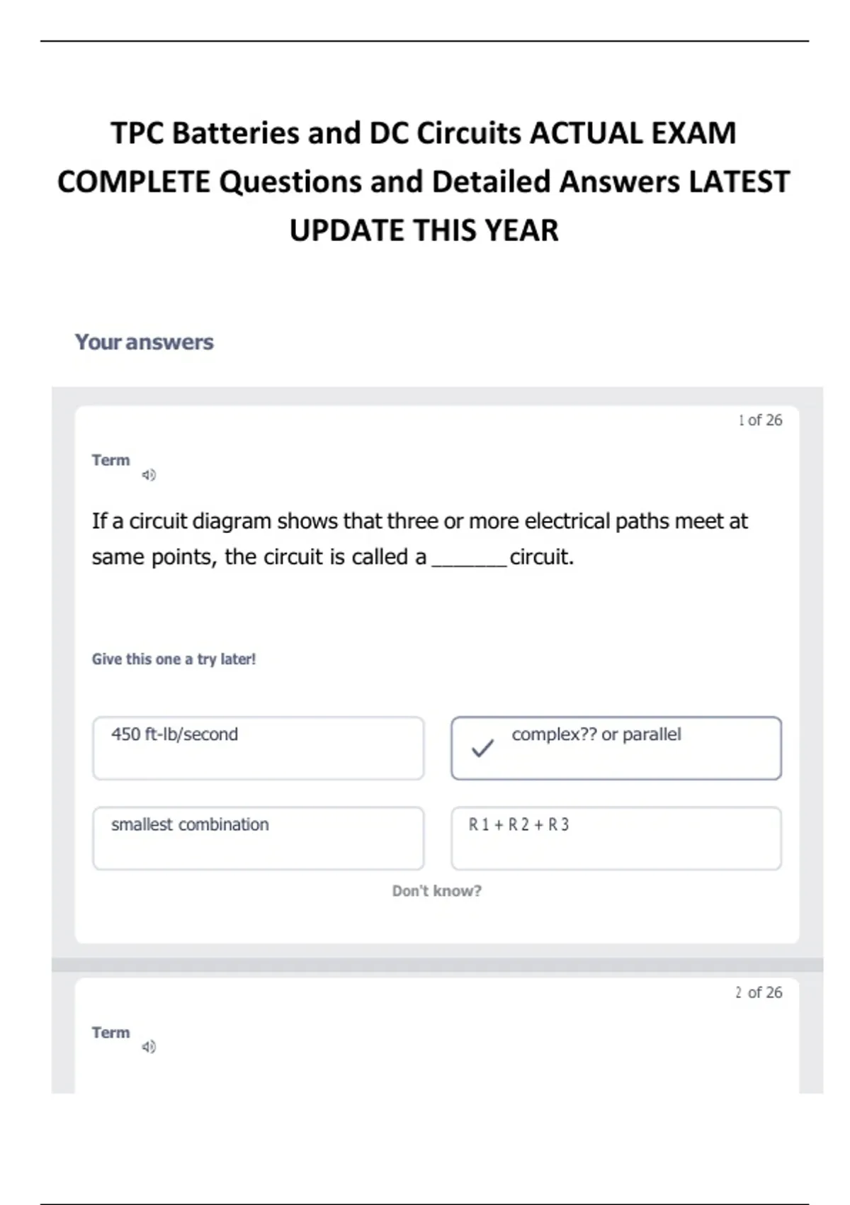 TPC Batteries and DC Circuits ACTUAL EXAM COMPLETE Questions and Detailed Answers LATEST UPDATE THIS YEAR