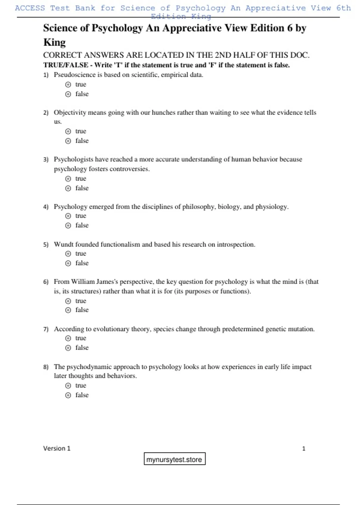 Test Bank – The Science of Psychology: An Appreciative View (6th Edition, by Laura A. King) – Verified Complete Edition with Correct Answers | Latest 2025/2026 Edition