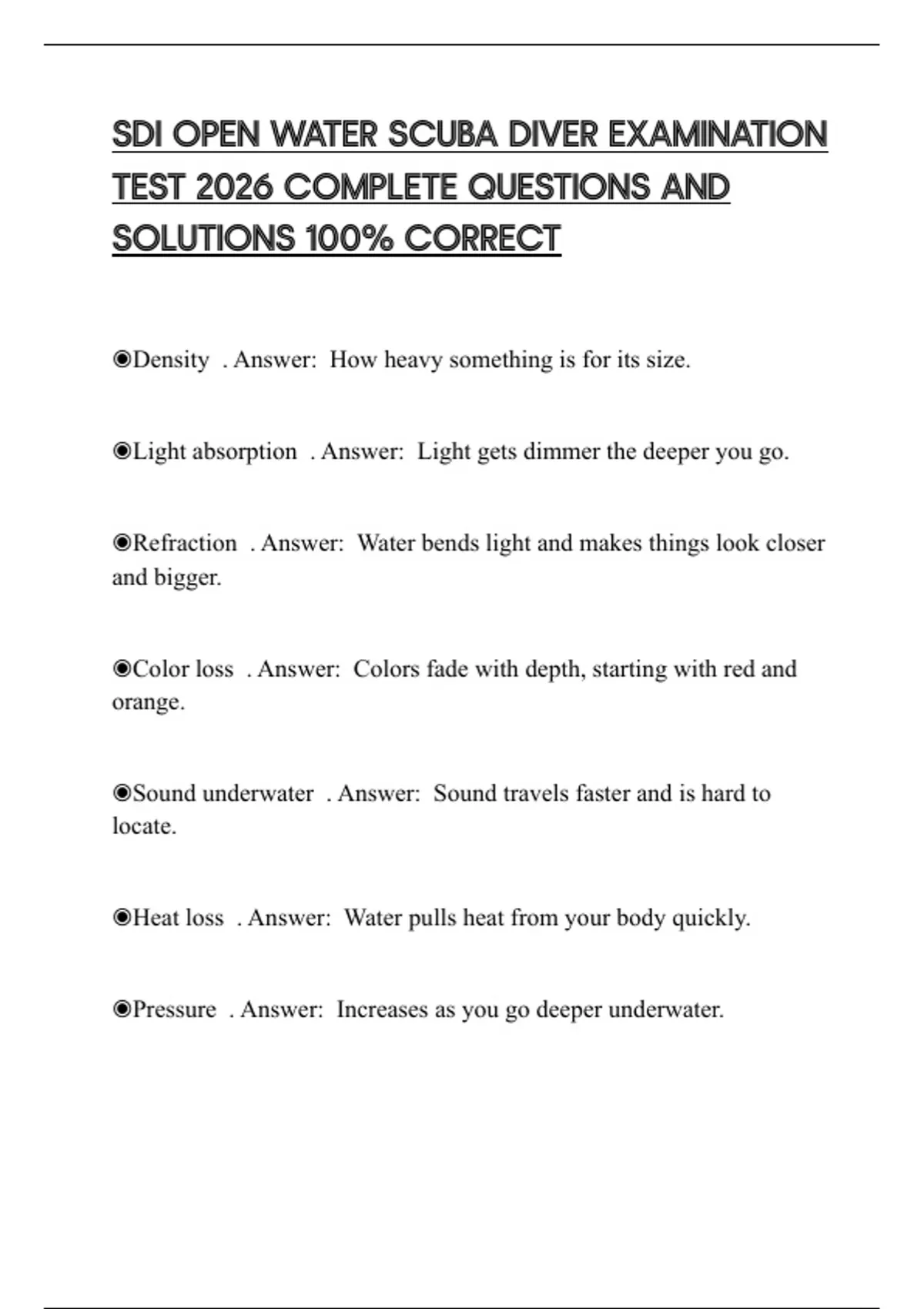 SDI OPEN WATER SCUBA DIVER EXAMINATION TEST 2026 COMPLETE QUESTIONS AND SOLUTIONS 100% CORRECT