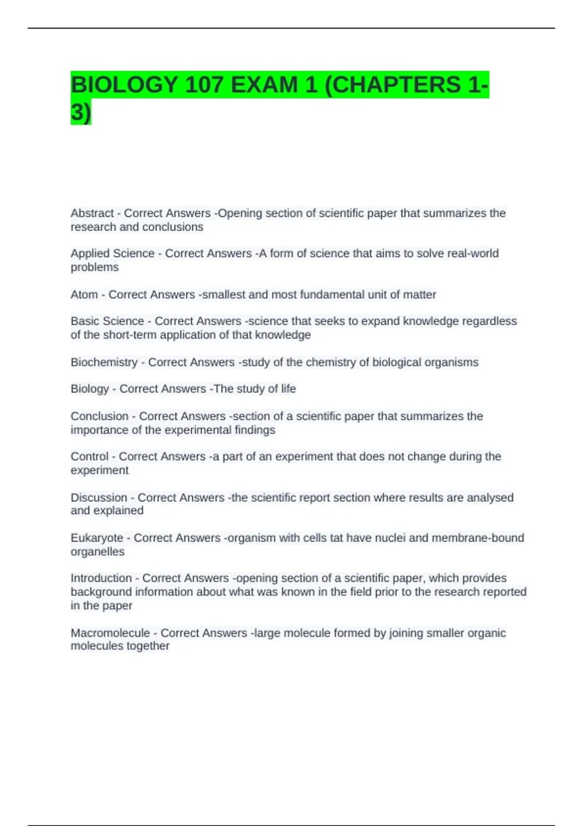 BIOLOGY 107 EXAM 1 (CHAPTERS 1-3) QUESTIONS AND ANSWERS