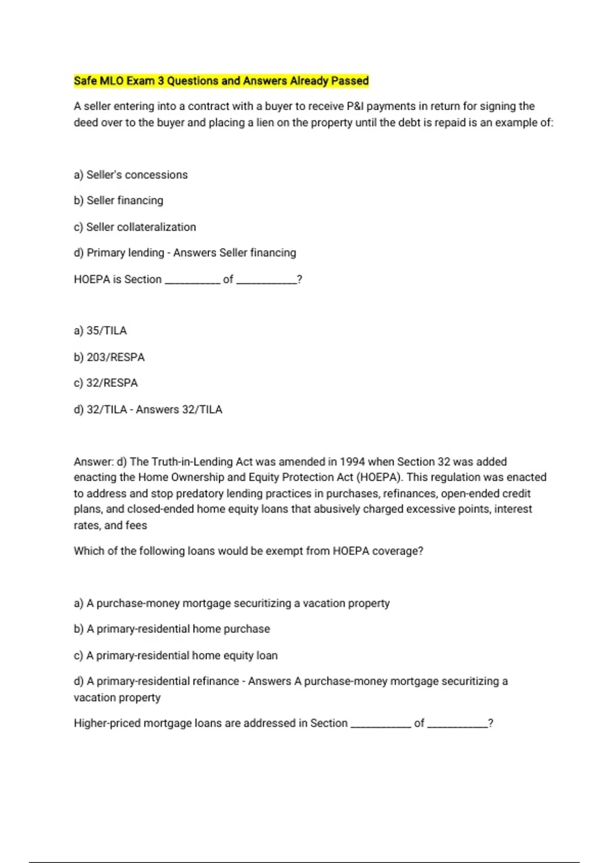d) A primary-residential refinance - Answers A purchase-money mortgage securitizing a