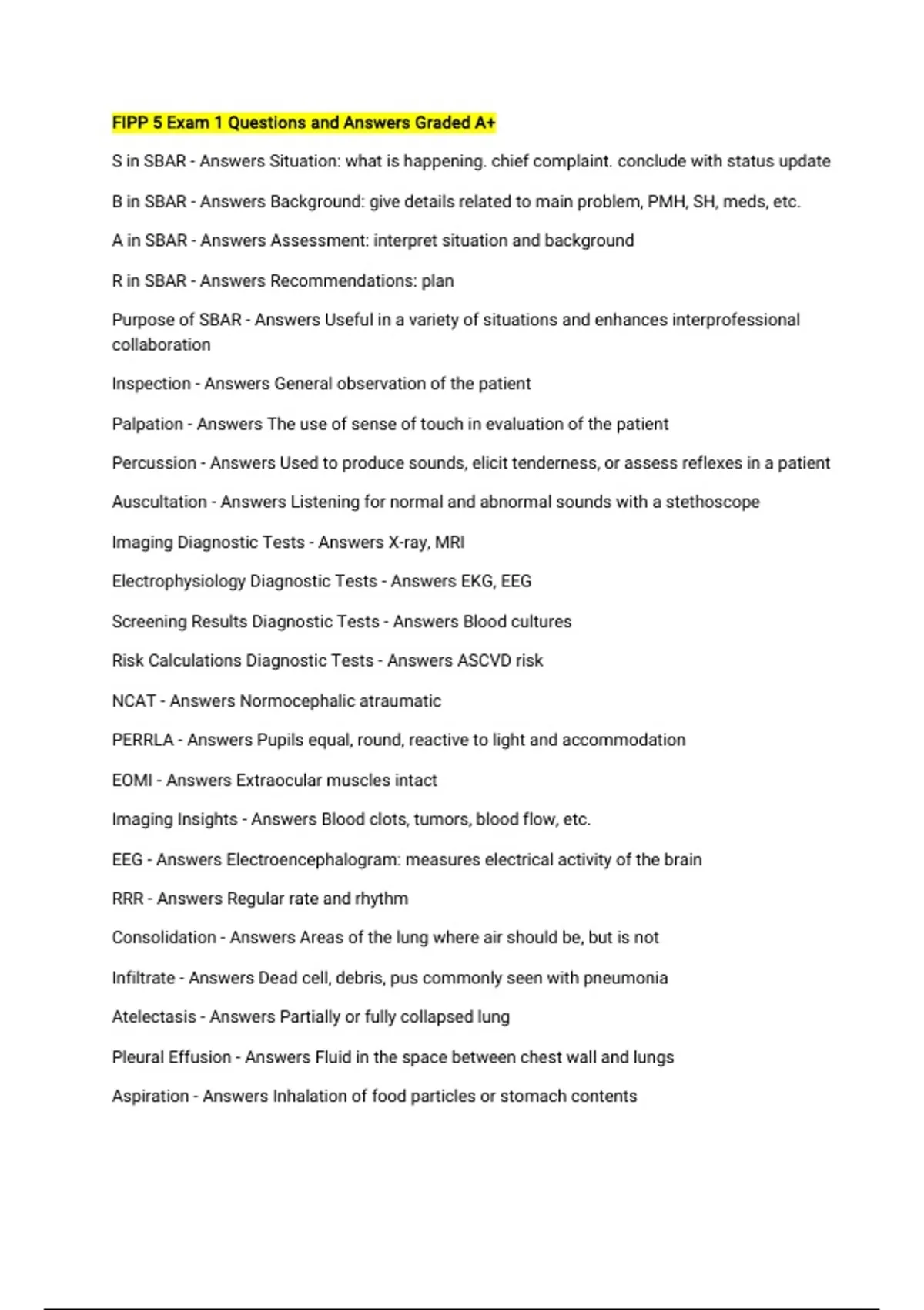 FIPP 5 Exam 1 Questions and Answers Graded A+ S in SBAR - Answers Situation: what is happening. chief complaint. conclude with status update B in SBAR - Answers Background: give details related to main problem, PMH, SH, meds, etc. A in SBAR - Answers Assessment: interpret situation and background R in SBAR - Answers Recommendations: plan Purpose of SBAR - Answers Useful in a variety of situations and enhances interprofessional collaboration Inspection - Answers General observation of the patient Palpation - Answers The use of sense of touch in evaluation of the patient Percussion - Answers Used to produce sounds, elicit tenderness, or assess reflexes in a patient Auscultation - Answers Listening for normal and abnormal sounds with a stethoscope Imaging Diagnostic Tests - Answers X-ray, MRI Electrophysiology Diagnostic Tests - Answers EKG, EEG Screening Results Diagnostic Tests - Answers Blood cultures Risk Calculations Diagnostic Tests - Answers ASCVD risk NCAT - Answers Normocephalic atraumatic PERRLA - Answers Pupils equal, round, reactive to light and accommodation EOMI - Answers Extraocular muscles intact Imaging Insights - Answers Blood clots, tumors, blood flow, etc. EEG - Answers Electroencephalogram: measures electrical activity of the brain RRR - Answers Regular rate and rhythm Consolidation - Answers Areas of the lung where air should be, but is not Infiltrate - Answers Dead cell, debris, pus commonly seen with pneumonia Atelectasis - Answers Partially or fully collapsed lung Pleural Effusion - Answers Fluid in the space between chest wall and lungs Aspiration - Answers Inhalation of food particles or stomach contents CT Scan - Answers Computed tomography scan. Assesses pulmonary embolism, lung masses, internal bleeding, edema. May also require IV contrasts Echo - Answers Echocardiogram. Ultrasound of heart. Info about size, shape, pumping of heart EKG/ECG - Answers Electrocardiogram. Measures electrical activity of the heart Cardiac Catheterization - Answers Looks for disease of heart muscle using coronary angiography (contrast dye) to see movement through arteries PFT - Answers Pulmonary function test. Measures lung volume using FEV1 and FVC