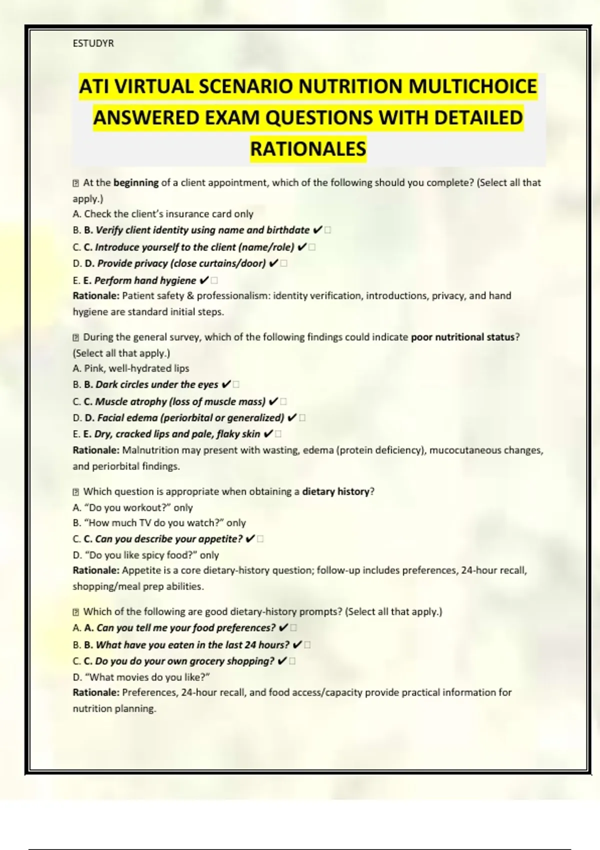 ATI VIRTUAL SCENARIO NUTRITION MULTICHOICE ANSWERED EXAM QUESTIONS WITH DETAILED RATIONALES