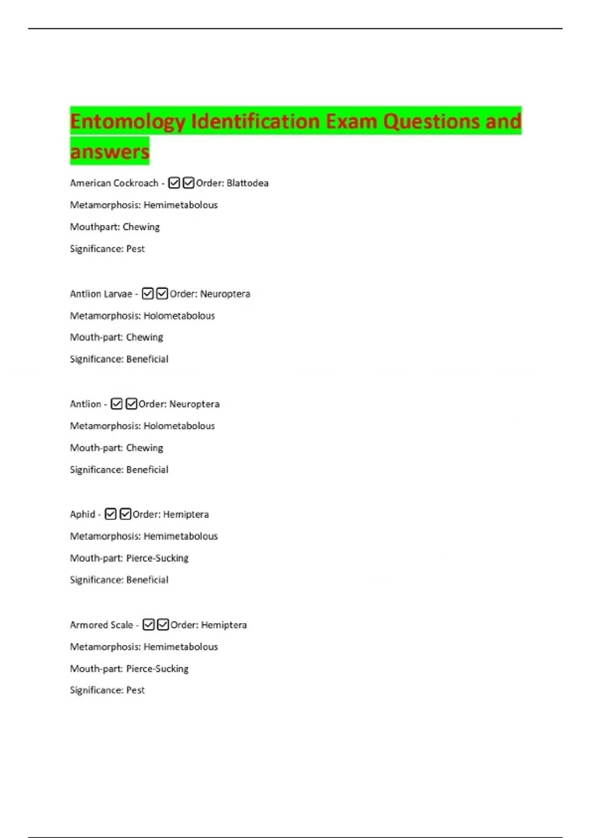 Entomology Identification Exam Questions and answers American Cockroach - Order: Blattodea Metamorphosis: Hemimetabolous Mouthpart: Chewing Significance: Pest Antlion Larvae - Order: Neuroptera Metamorphosis: Holometabolous Mouth-part: Chewing Significance: Beneficial Antlion - Order: Neuroptera Metamorphosis: Holometabolous