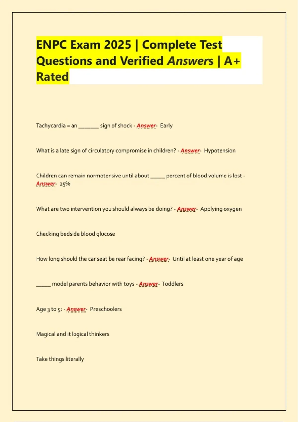 Prepare with confidence for the 2025 Emergency Nursing Pediatric Course (ENPC) exam using this comprehensive, A+ rated study pack. It includes a full set of updated test questions and verified answers aligned with the latest ENA guidelines. Designed for nurses and emergency care providers, this resource covers pediatric assessment, trauma care, shock management, airway interventions, and family-centered care. Whether you're reviewing for certification or refreshing your clinical knowledge, this pack delivers high-yield content, clear rationales, and real-exam readiness—perfect for passing on the first try