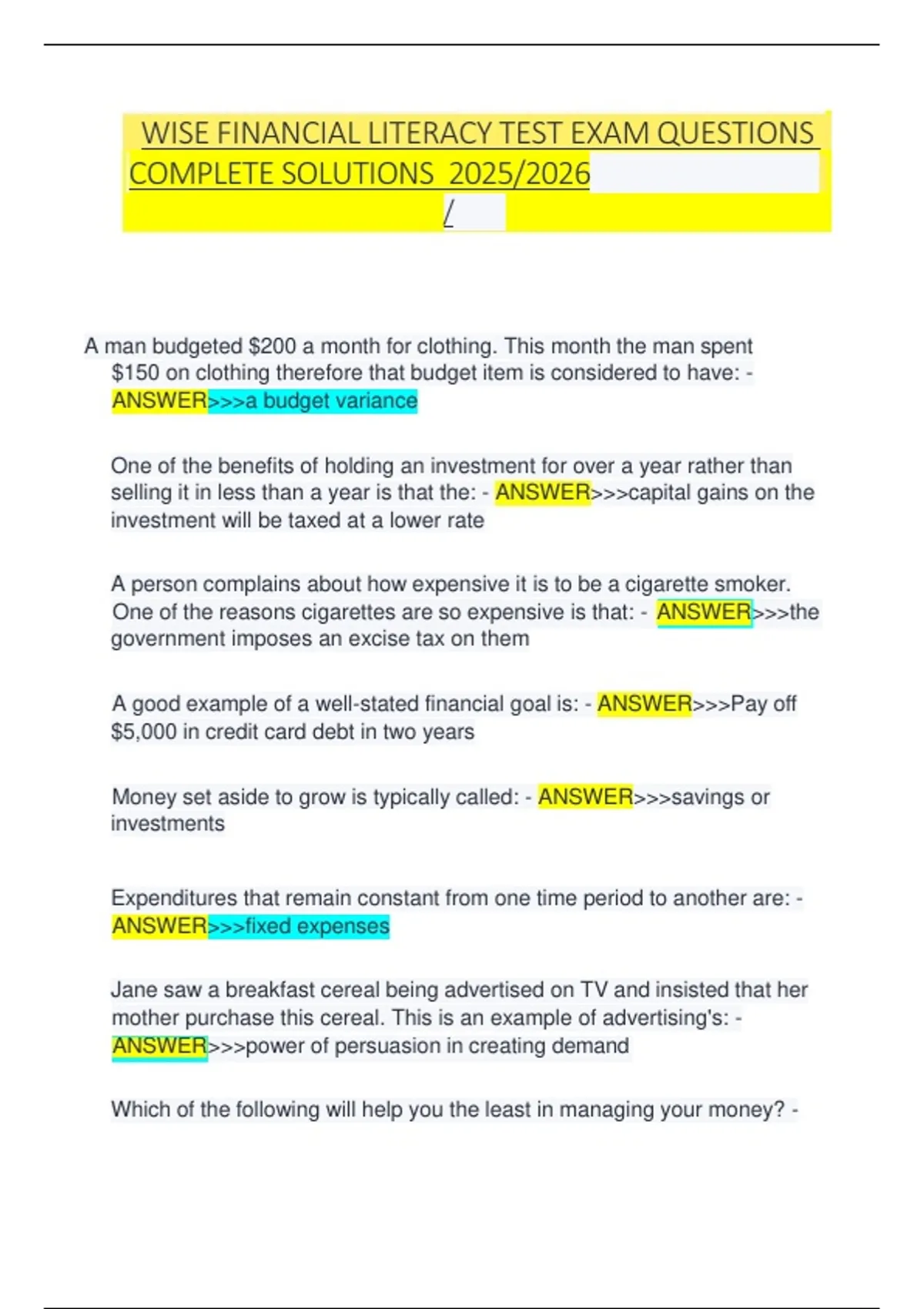 WISE FINANCIAL LITERACY TEST EXAM QUESTIONS WITH / COMPLETE SOLUTIONS 2025/2026