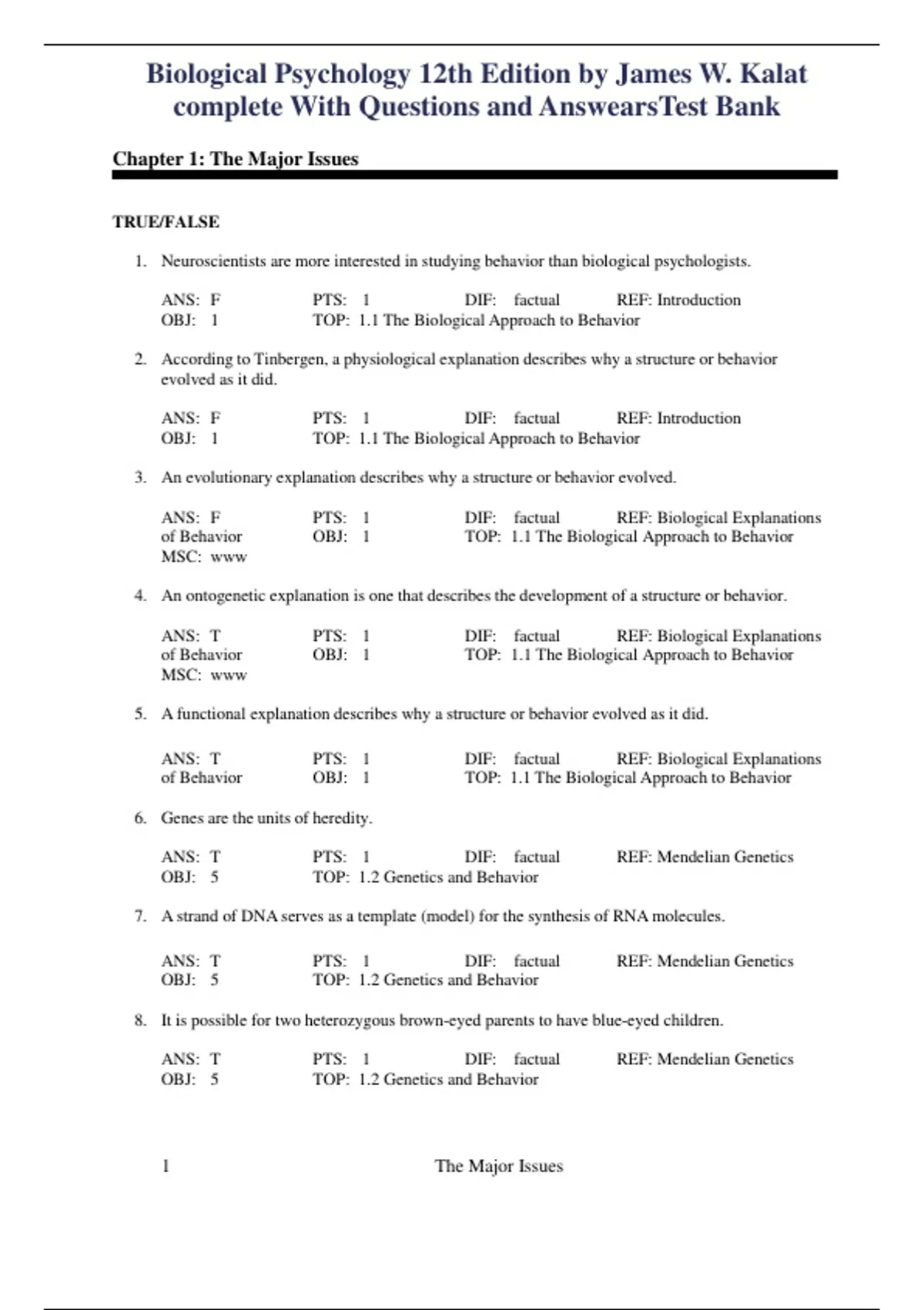 The Test Bank for Biological Psychology 12th Edition by James W. Kalat provides a complete collection of exam-style questions and detailed answers covering the foundations of behavioral neuroscience and biological bases of behavior. This 2025 verified edition includes multiple-choice, application-based, and conceptual questions designed to help psychology and neuroscience students master key topics such as neural communication, brain anatomy, neurotransmission, emotion, learning, and mental disorders. Perfect for university exam preparation, classroom quizzes, and self-study, this resource ensures in-depth comprehension of the biological mechanisms underlying behavior—making it ideal for psychology majors and health science programs.