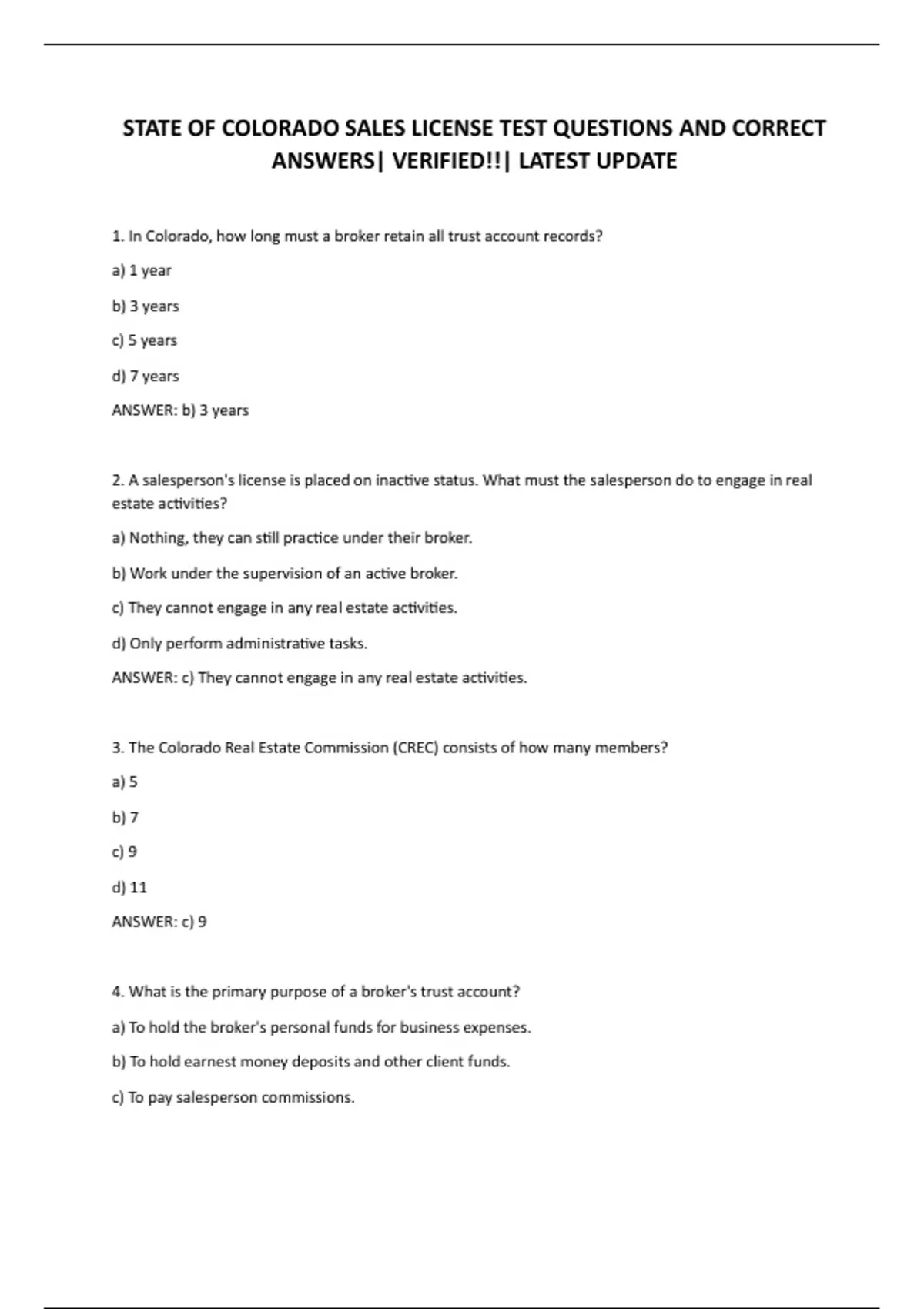 STATE OF COLORADO SALES LICENSE TEST QUESTIONS AND CORRECT ANSWERS| VERIFIED!!| LATEST UPDATE