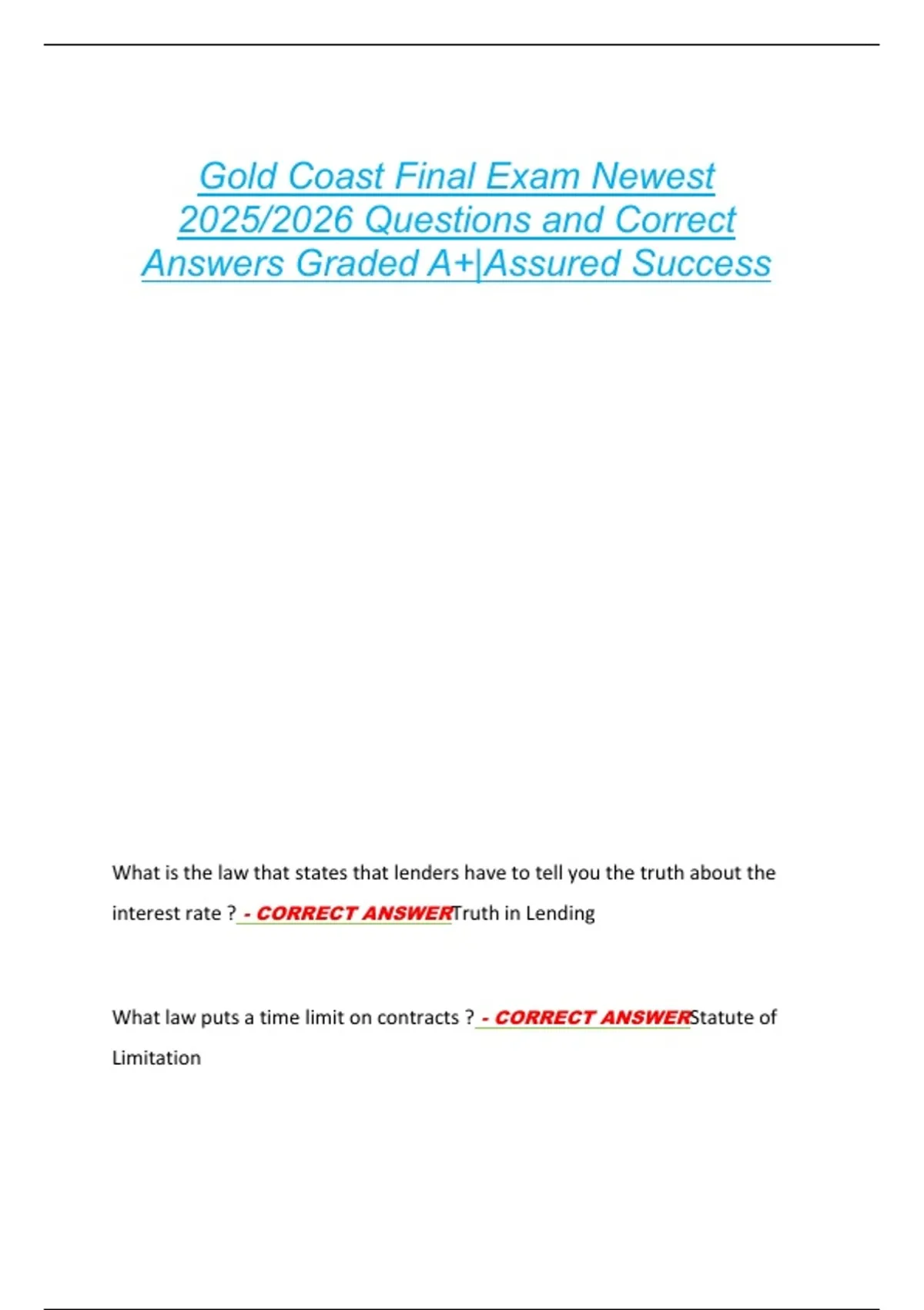 Gold Coast Final Exam Newest 2025/2026 Questions and Correct Answers Graded A+|Assured Success
