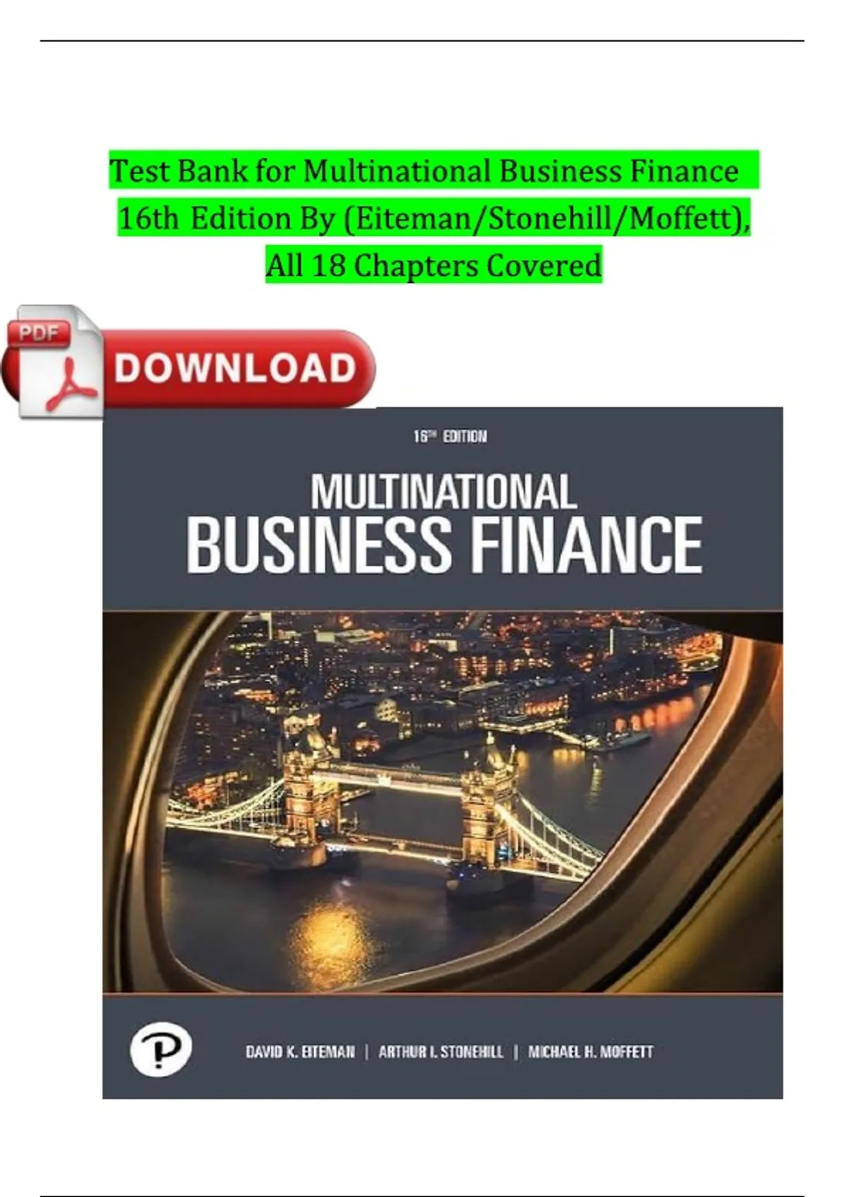 This document is a comprehensive test bank for the 16th Edition of the textbook Multinational Business Finance by David K. Eiteman, Arthur I. Stonehill, and Michael H. Moffett. It provides verified questions and answers covering all 18 chapters of the text. The content is structured into five main parts: the Global Financial Environment, Foreign Exchange Theory & Markets, Foreign Exchange Exposure (Transaction, Translation, and Operating), Financing the Global Firm, and Foreign Investments and Investment Analysis, including multinational capital budgeting and cross-border acquisitions. It is a vital resource for students and instructors focused on the financial management challenges and opportunities in a global context.