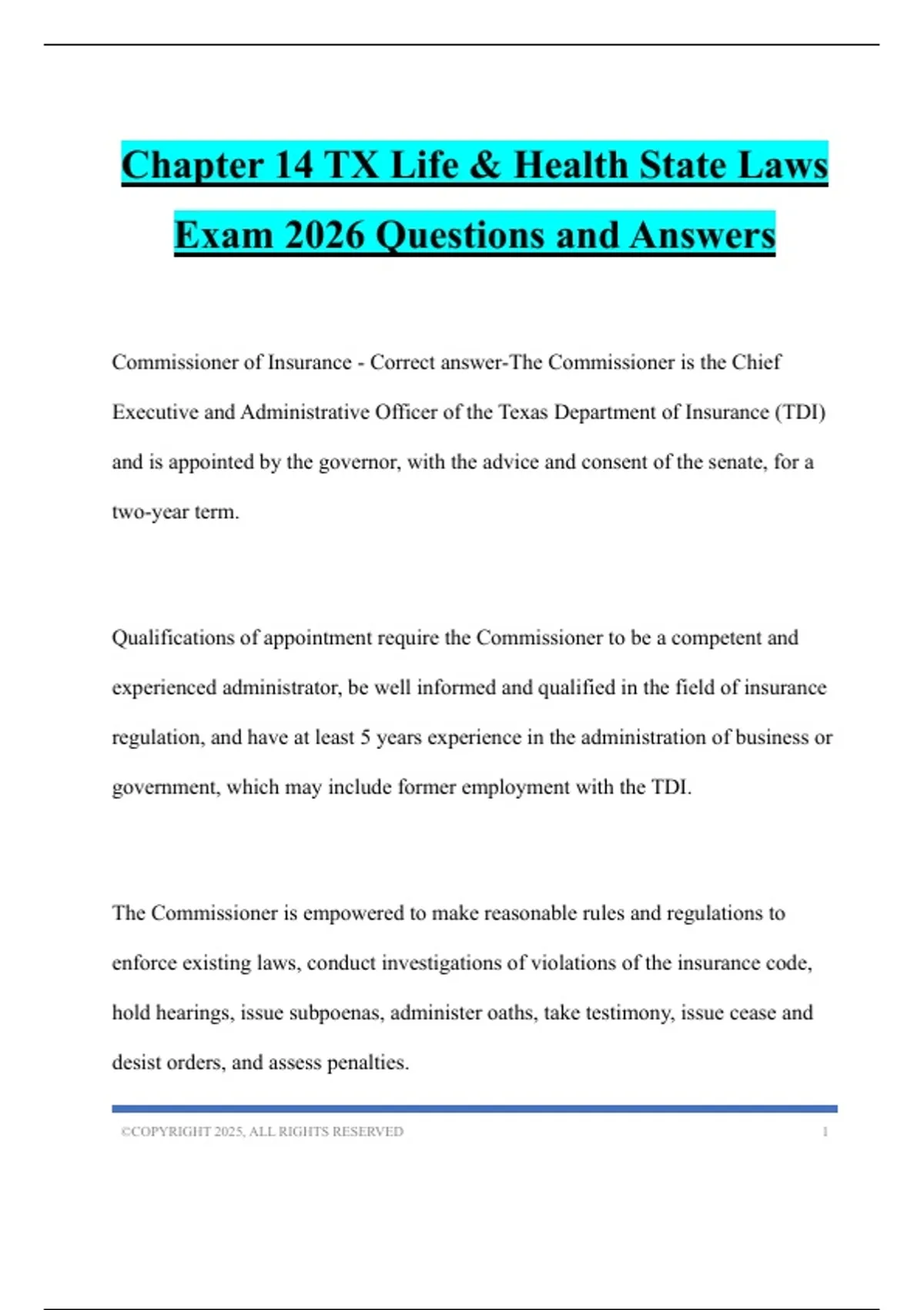 the Texas Department of Insurance)? - Correct answer-Appointed by the governor