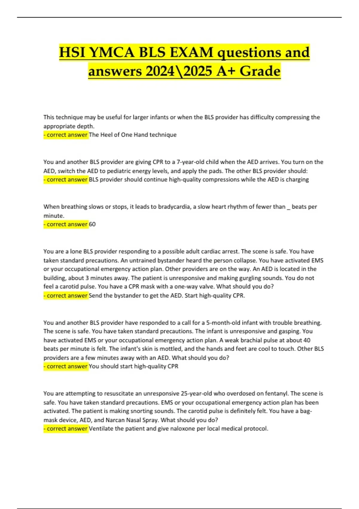 The HSI YMCA BLS Exam (2024/2025 Edition) is a verified, A+ graded study guide with over 100 updated exam questions and correct answers. It prepares candidates for the Basic Life Support (BLS) certification under HSI/YMCA guidelines, ensuring mastery of CPR, AED use, and emergency response for adults, children, and infants.The HSI YMCA BLS Exam is part of the Health & Safety Institute (HSI) training program, often delivered through YMCA and other organizations. It certifies healthcare providers and lay rescuers in Basic Life Support (BLS). Key Learning Objectives: Perform high-quality CPR for adults, children, and infants. Use an AED (Automated External Defibrillator) safely and effectively. Recognize and respond to cardiac arrest, respiratory arrest, and choking emergencies. Apply team dynamics in resuscitation scenarios.