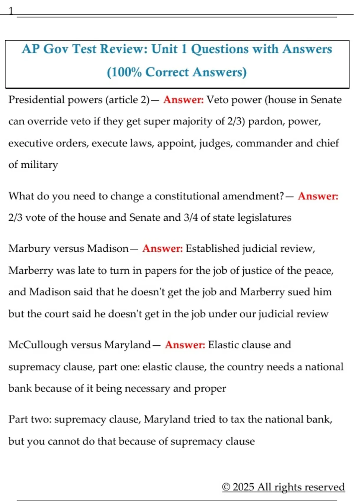 AP Gov Test Review: Unit 1 Questions with Answers