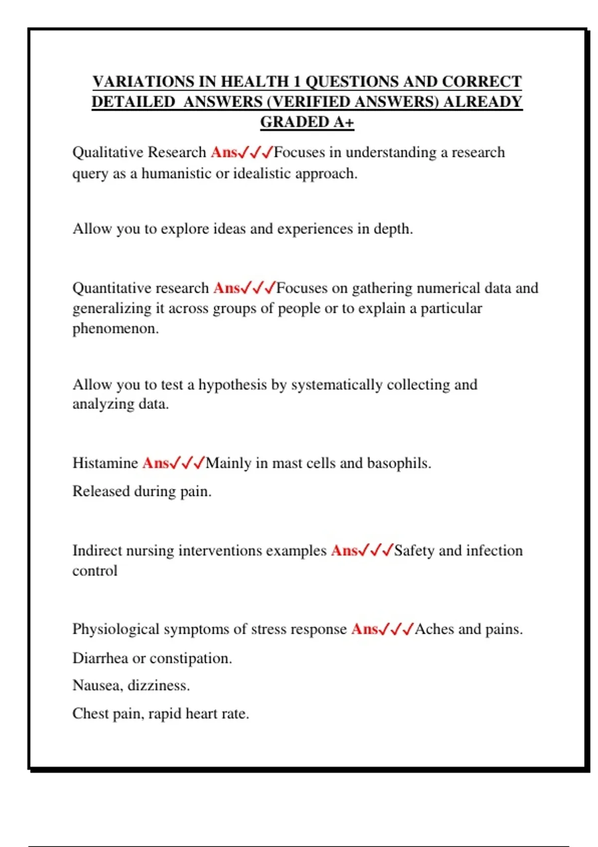 VARIATIONS IN HEALTH 1 QUESTIONS AND CORRECT DETAILED ANSWERS (VERIFIED ANSWERS) ALREADY GRADED A+