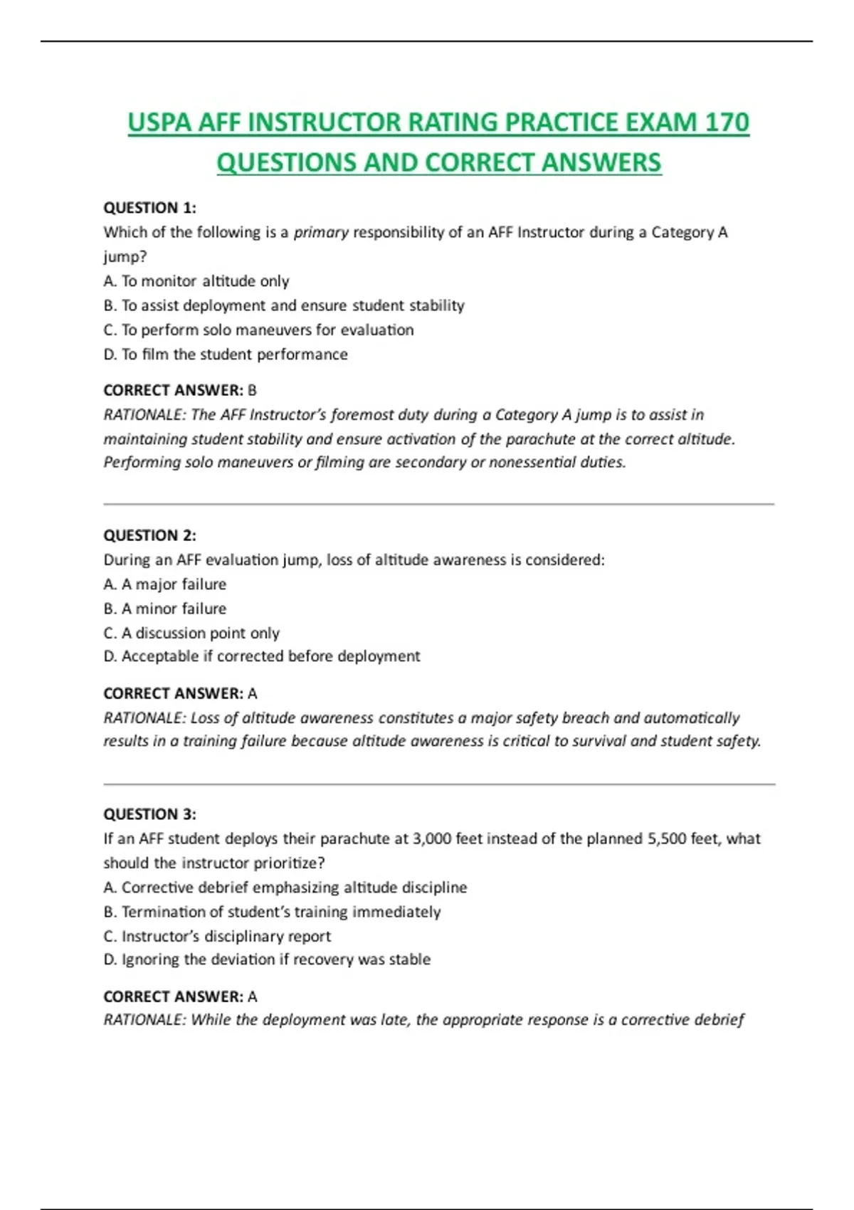 RATIONALE: The AFF Instructor’s foremost duty during a Category A jump is to assist in