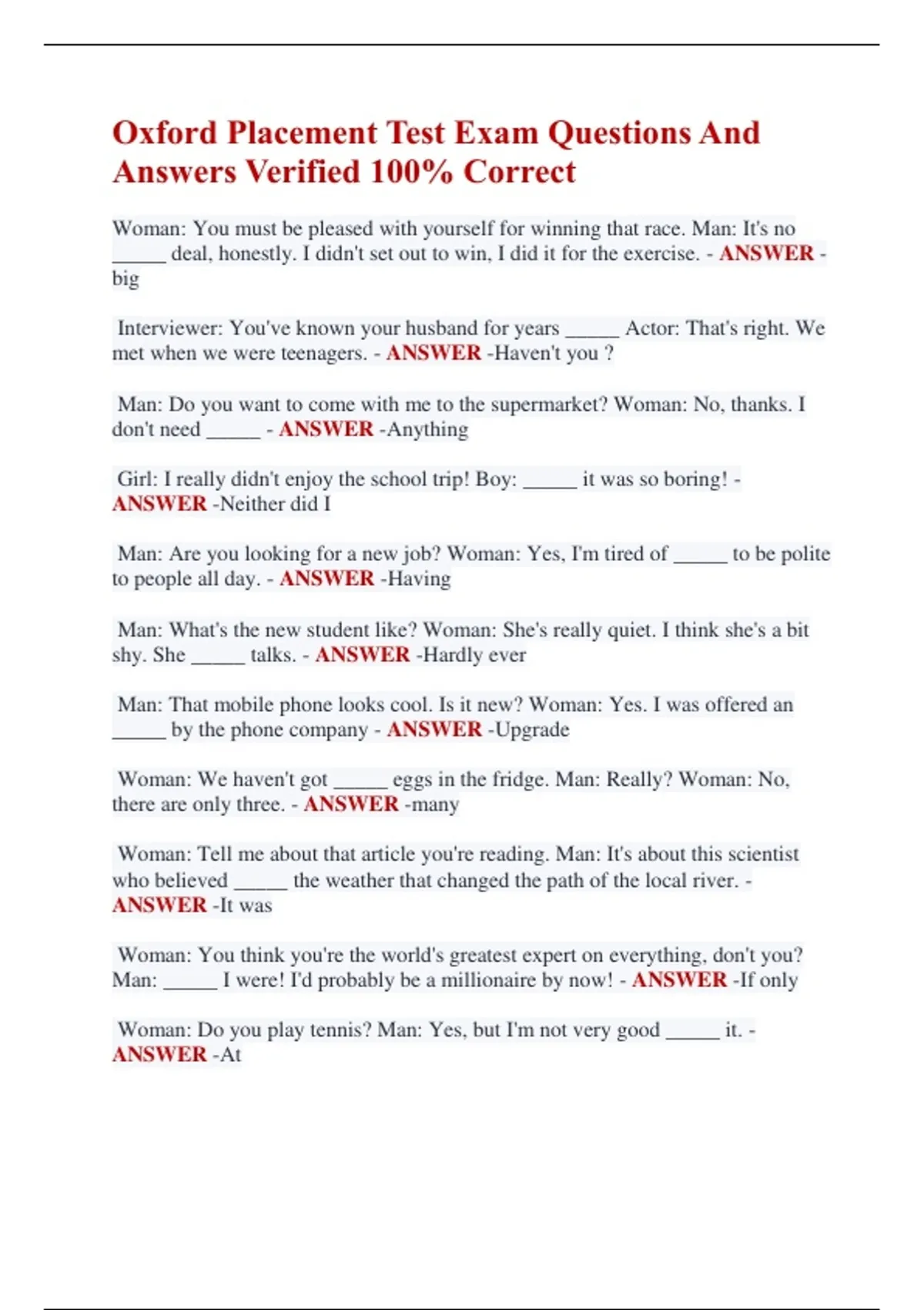 Oxford Placement Test Exam Questions And Answers Verified 100% Correct Woman: You must be pleased with yourself for winning that race. Man: It's no _____ deal, honestly. I didn't set out to win, I did it for the exercise. - ANSWER big Interviewer: You've known your husband for years _____ Actor: That's right. We met when we were teenagers. - ANSWER -Haven't you ? Man: Do you want to come with me to the supermarket? Woman: No, thanks. I don't need _____ - ANSWER -Anything Girl: I really didn't enjoy the school trip! Boy: _____ it was so boring! - ANSWER -Neither did I Man: Are you looking for a new job? Woman: Yes, I'm tired of _____ to be polite to people all day. - ANSWER -Having Man: What's the new student like? Woman: She's really quiet. I think she's a bit shy. She _____ talks. - ANSWER -Hardly ever Man: That mobile phone looks cool. Is it new? Woman: Yes. I was offered an _____ by the phone company - ANSWER -Upgrade Woman: We haven't got _____ eggs in the fridge. Man: Really? Woman: No, there are only three. - ANSWER -many Woman: Tell me about that article you're reading. Man: It's about this scientist who believed _____ the weather that changed the path of the local river. - ANSWER -It was Woman: You think you're the world's greatest expert on everything, don't you? Man: _____ I were! I'd probably be a millionaire by now! - ANSWER -If only Woman: Do you play tennis? Man: Yes, but I'm not very good _____ it. - ANSWER -At Man: _____ I speak to Mr Brown, please? Woman: He's not here, I'm afraid. - ANSWER -Could Woman: You look stressed. What's the matter? Man: haven't had a minute to myself _____ I started this new course. - ANSWER -Since Man: Why are you smiling like that? Woman: It's my score in the French test. _____ such a good one before. - ANSWER -I've never had / I have never had Woman: Do you know what1 really like about the weekends? Man: What? Woman: _____ have to get up early - ANSWER -I don't Woman: You'll never be able to settle down if you don't get a steady job. Man: _____ But if I did get a steady job, I wouldn't want to settle down. - ANSWER Even Woman: Thank you very much for fixing my bike so quickly Man: Pleasure! Woman: Won't you consider letting me _____ you for your time? - ANSWER pay Woman: Why on earth do you want to become a plumber? Man: Look -it's a _____ skilled job and it brings in a lot of money. - ANSWER -Highly Woman: Why do we never do anything interesting in the evenings? Man: Well, if we _____ enough time, we could - but we always seem to be busy - ANSWER had Woman: I'll be back in the office early on Monday. Man: Right. _____ a good weekend, then. - ANSWER -Have Woman: _____ do you do? Man: I'm a chef in an Italian restaurant. - ANSWER What Woman: Do you know what I really like about the weekends? Man: What? Woman: _____ have to get up early. - ANSWER -I don't Man: _____ did you get to Paris? Woman: By coach. It was a lot cheaper. - ANSWER -How Woman: How far is _____ to the bus stop? Man: Only about five minutes' walk. - ANSWER -It Woman: Is _____ any ice in the fridge? Man: Yes. Help yourself. - ANSWER There Man: How's Carlo getting on with his geometry? Woman: Well, I think he'd really _____ from a few private lessons. - ANSWER -Benefit Man: I had to _____ that job offer in the end. Woman: Why? Man: The salary just wasn't good enough. - ANSWER -Turn down Man: _____ wrong? Woman: I don't feel very well. - ANSWER -What's Husband: Shall I prepare the vegetables for dinner? Wife: Yes but be careful not to cut _____ , the knife's sharp. - ANSWER -Yourself Woman: Come in - you look a bit cold. Man: Thanks-the wind's so strong it nearly blew my hat _____ . - ANSWER -Off Woman: Michael looks fed up. Man: Yes, he's just been _____ about his new promotion. Woman: What's the problem? Isn't he getting enough money? - ANSWER -Grumbling Woman: I've got loads of old discs in my cupboard. Man: What are you going to do with them? Woman: I don't know-it seems like _____ we get used to one thing, something new comes along! - ANSWER -Just as Woman: Can you tell me where the nearest garage is? Man: Turn right _____ the next crossroads. You can't miss it. Woman: Thanks. - ANSWER -At Man: Why did you decide to _____ another job? Woman: I wasn't happy with the one I had. - ANSWER -Look for Girl: I thought it was a bit boring. Boy: Me too. The other team didn't get the ball very much, _____? - ANSWER -Did they Man: I'm not going to Peter's wedding. Woman: Oh-why not? Man: Because I _____ invited. - ANSWER -Haven't