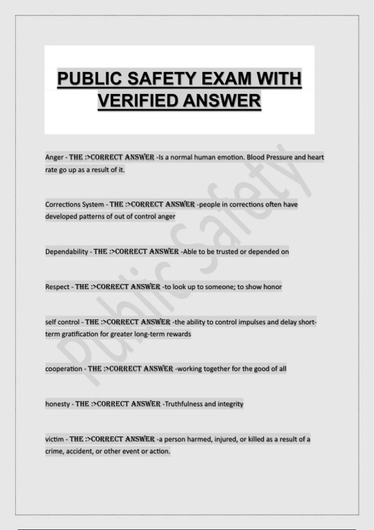 PUBLIC SAFETY EXAM WITH VERIFIED ANSWER Anger - THE :>CORRECT ANSWER -Is a normal human emotion. Blood Pressure and heart rate go up as a result of it. Corrections System - THE :>CORRECT ANSWER -people in corrections often have developed patterns of out of control anger Dependability - THE :>CORRECT ANSWER -Able to be trusted or depended on Respect - THE :>CORRECT ANSWER -to look up to someone; to show honor self control - THE :>CORRECT ANSWER -the ability to control impulses and delay short term gratification for greater long-term rewards cooperation - THE :>CORRECT ANSWER -working together for the good of all honesty - THE :>CORRECT ANSWER -Truthfulness and integrity victim - THE :>CORRECT ANSWER -a person harmed, injured, or killed as a result of a crime, accident, or other event or action.