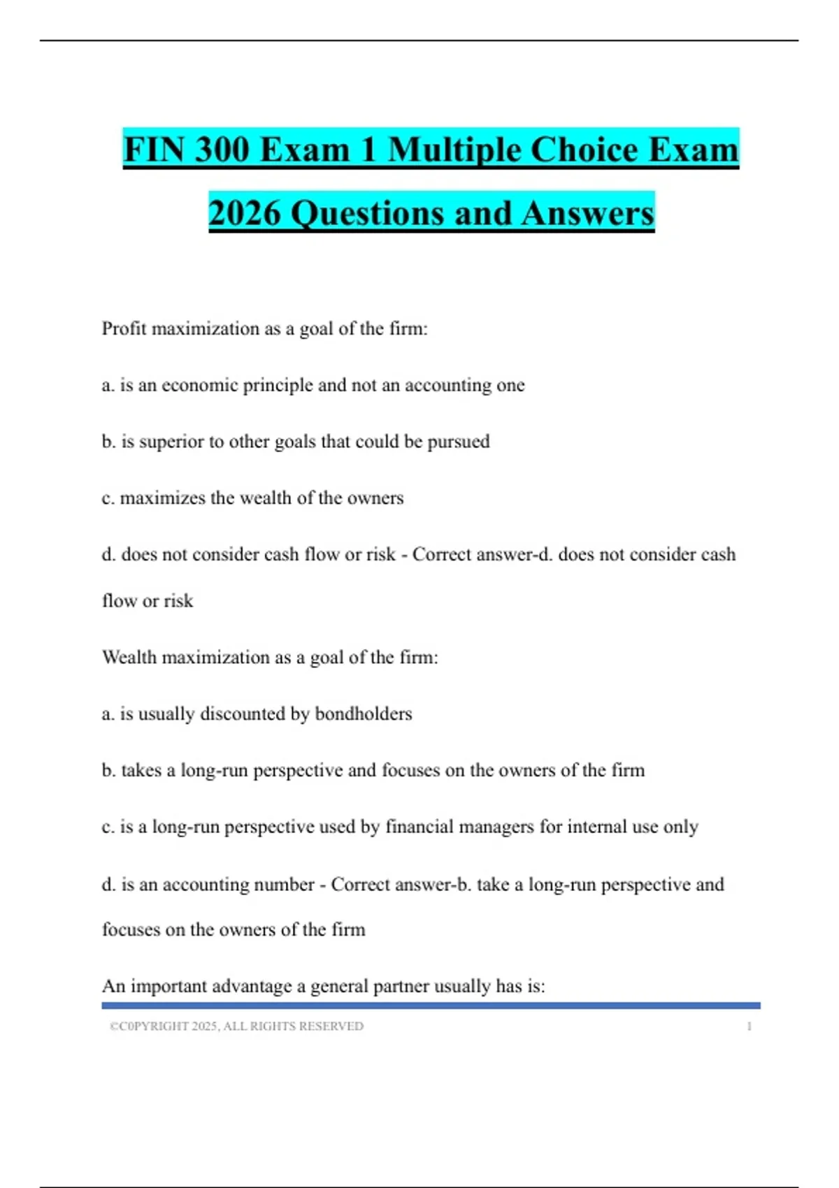FIN 300 Exam 1 Multiple Choice Exam 2026 Questions and Answers