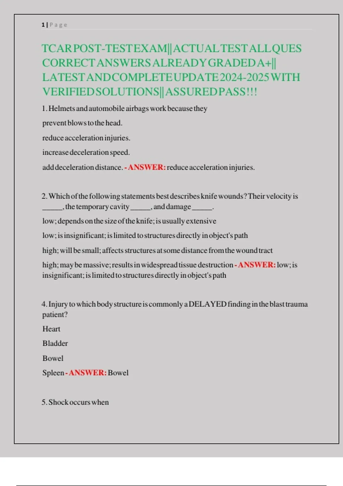 TCAR POST | TCAR POST TEST EXAM 50 QUESTIONS AND CORRECT {VERIFIED} ANSWERS NEWEST UPDATE|ALREADY GRADED A+. TCAR POST | TCAR POST TEST EXAM 50 QUESTIONS AND CORRECT {VERIFIED} ANSWERS NEWEST UPDATE|ALREADY GRADED A+. TCAR POST | TCAR POST TEST EXAM 50 QUESTIONS AND CORRECT {VERIFIED} ANSWERS NEWEST UPDATE|ALREADY GRADED A+.