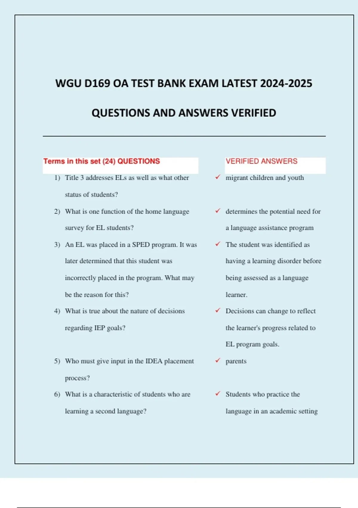 WGU D169 OA TEST BANK EXAM LATEST QUESTIONS AND ANSWERS VERIFIED