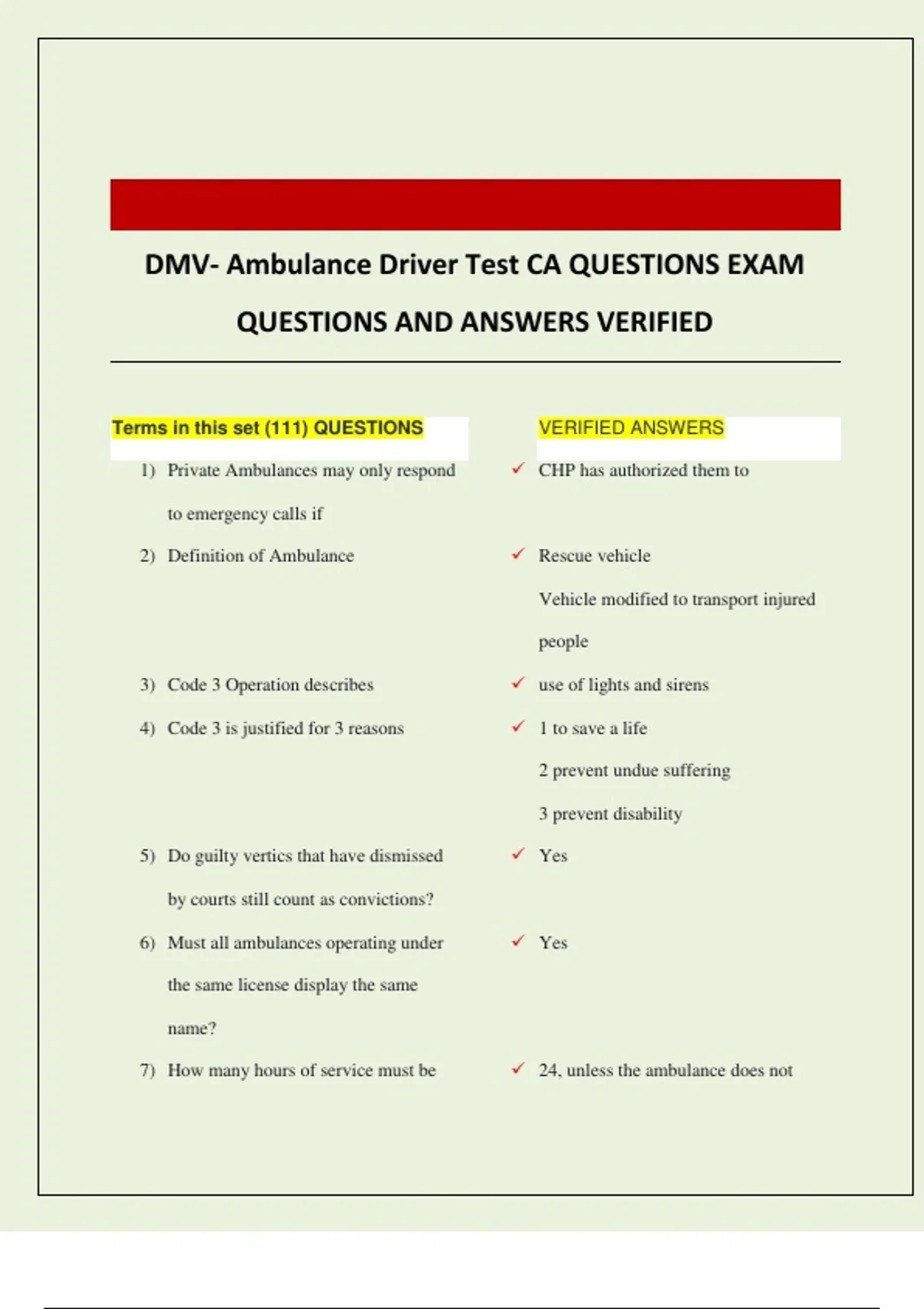 DMV- Ambulance Driver Test CA QUESTIONS EXAM