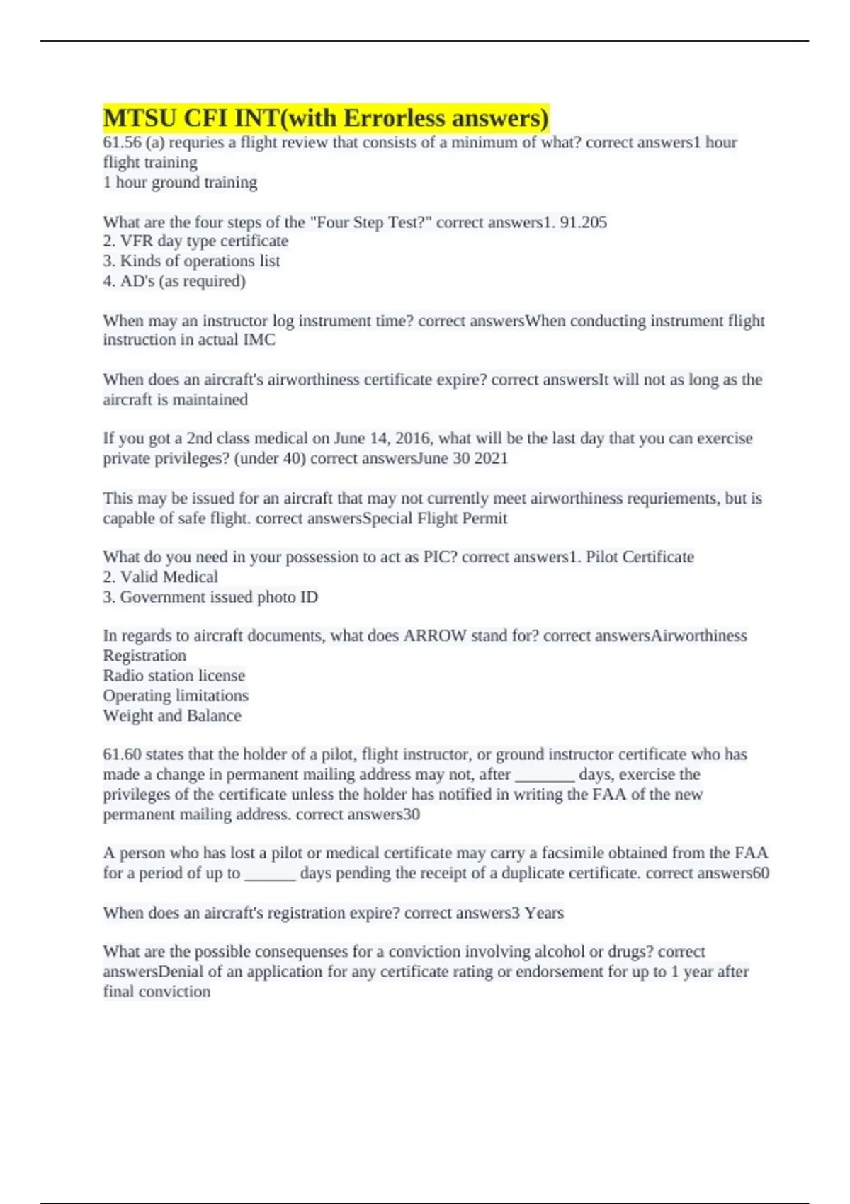 61.56 (a) requries a flight review that consists of a minimum of what? correct answers1 hour flight training 1 hour ground training What are the four steps of the "Four Step Test?" correct answers1. 91.205 2. VFR day type certificate 3. Kinds of operations list 4. AD's (as required) When may an instructor log instrument time? correct answersWhen conducting instrument flight instruction in actual IMC When does an aircraft's airworthiness certificate expire? correct answersIt will not as long as the aircraft is maintained If you got a 2nd class medical on June 14, 2016, what will be the last day that you can exercise private privileges? (under 40) correct answersJune 30 2021 This may be issued for an aircraft that may not currently meet airworthiness requriements, but is capable of safe flight. correct answersSpecial Flight Permit What do you need in your possession to act as PIC? correct answers1. Pilot Certificate 2. Valid Medical 3. Government issued photo ID In regards to aircraft documents, what does ARROW stand for? correct answersAirworthiness Registration Radio station license Operating limitations Weight and Balance 61.60 states that the holder of a pilot, flight instructor, or ground instructor certificate who has made a change in permanent mailing address may not, after _______ days, exercise the privileges of the certificate unless the holder has notified in writing the FAA of the new permanent mailing address. correct answers30 A person who has lost a pilot or medical certificate may carry a facsimile obtained from the FAA for a period of up to ______ days pending the receipt of a duplicate certificate. correct answers60 When does an aircraft's registration expire? correct answers3 Years What are the possible consequenses for a conviction involving alcohol or drugs? correct answersDenial of an application for any certificate rating or endorsement for up to 1 year after final conviction