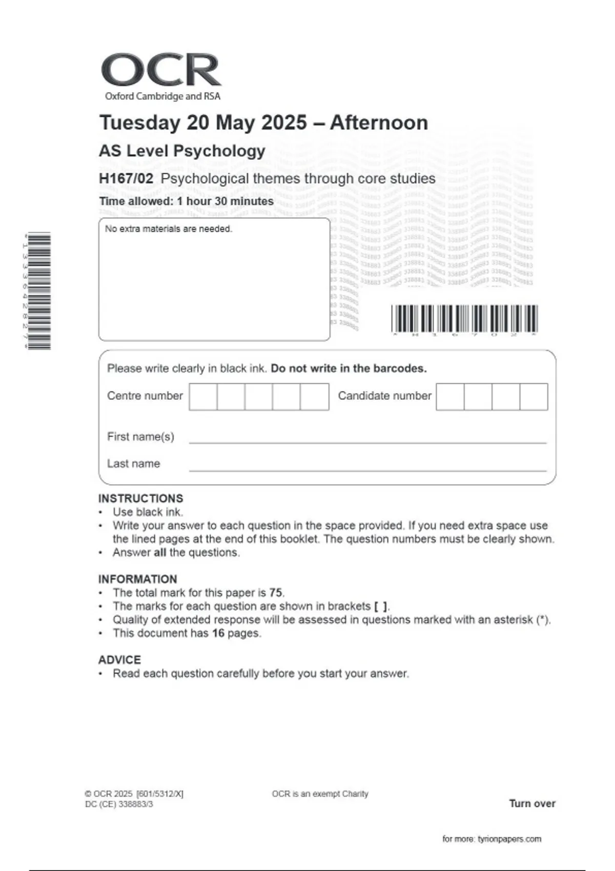 OCR AS Level Psychology H167/02 JUNE 2025 QUESTION PAPER: Psychological themes through core studies